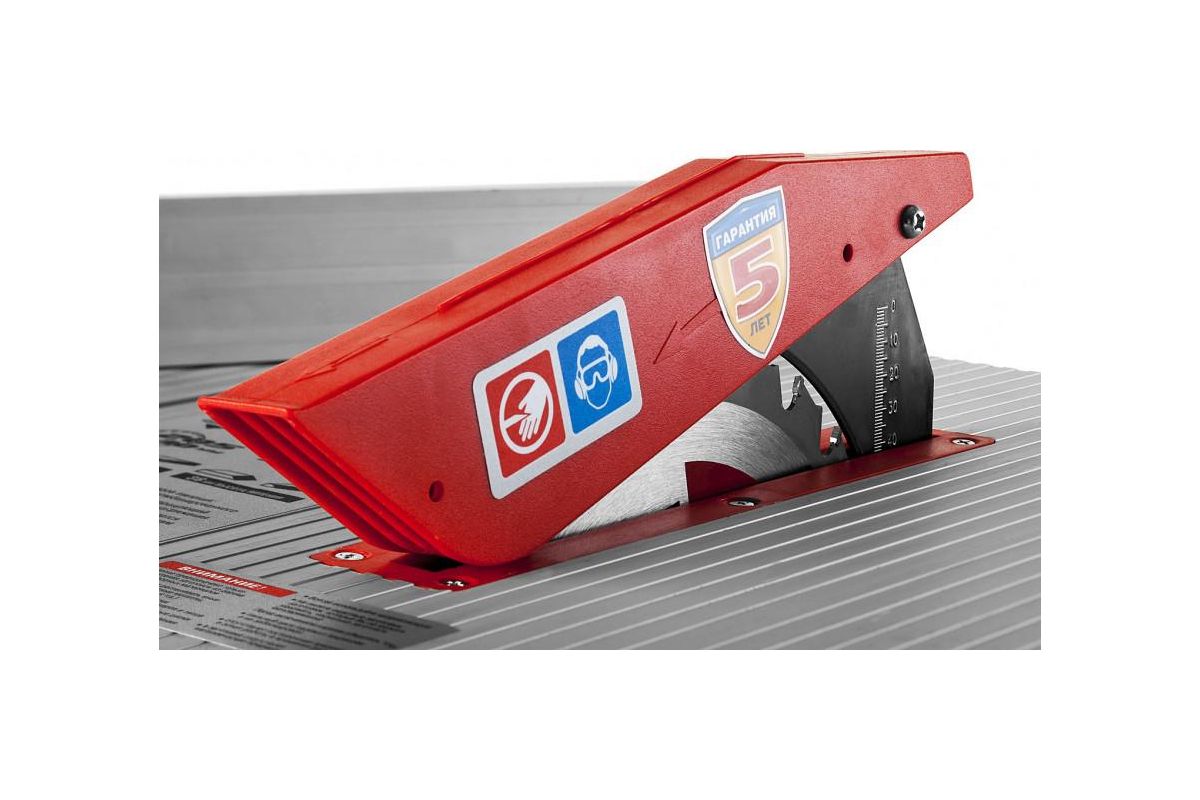 - Защитный кожух диска автоматически откидывается при подаче заготовки и защищает оператора от травм и повреждений;