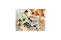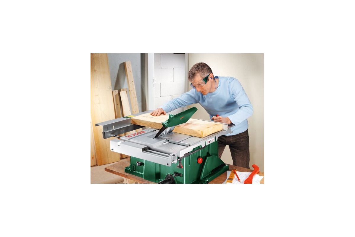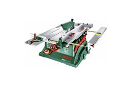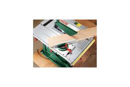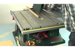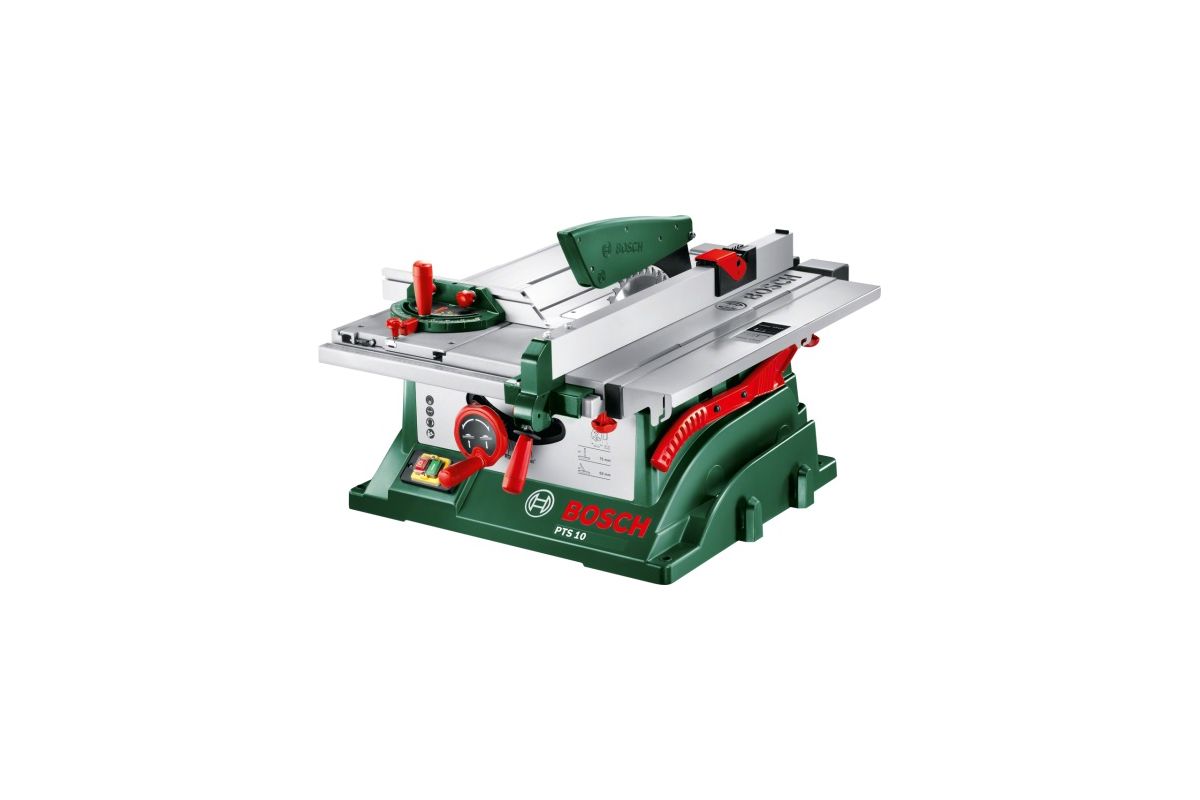 Настольный циркулярный станок BOSCH PTS 10 предназначен для небольших объемов пиления. Это удобная модель, которая будет полезна мастерам-любителям или в качестве вспомогательного инструмента на производстве. Оснащена двигателем на 1400 Вт с ограничением пускового тока. Диск диаметром 254 мм позволяет выполнять пропил на глубину до 75 мм. Параллельный упор с автоматической подстройкой обеспечивает точность реза. Особенность модели — встроенные подвижные салазки с угловым упором, с помощью которых удобно распиливать широкие доски. Благодаря удлинителям стола можно брать в работу крупноразмерные заготовки. Для отвода опилок предусмотрен патрубок (можно подключить пылесос).