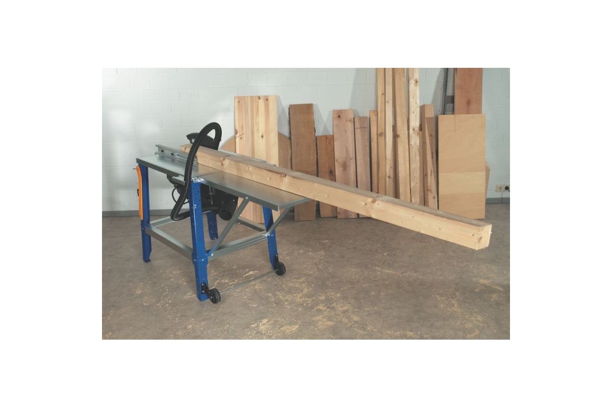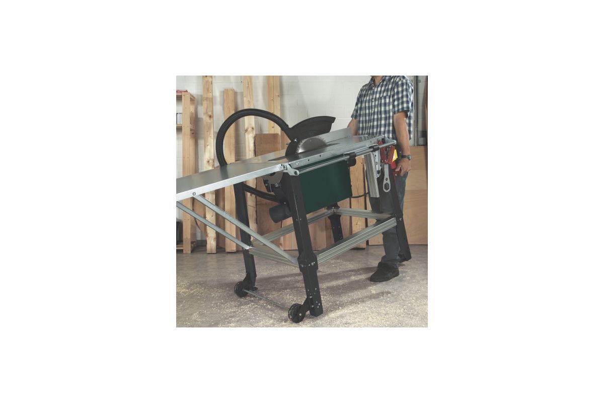 Ручки и колеса, которыми оснащена станина станка, облегчают его транспортировку. Пильный диск закрыт защитным кожухом. Это препятствует ранению оператора и порче инструмента.