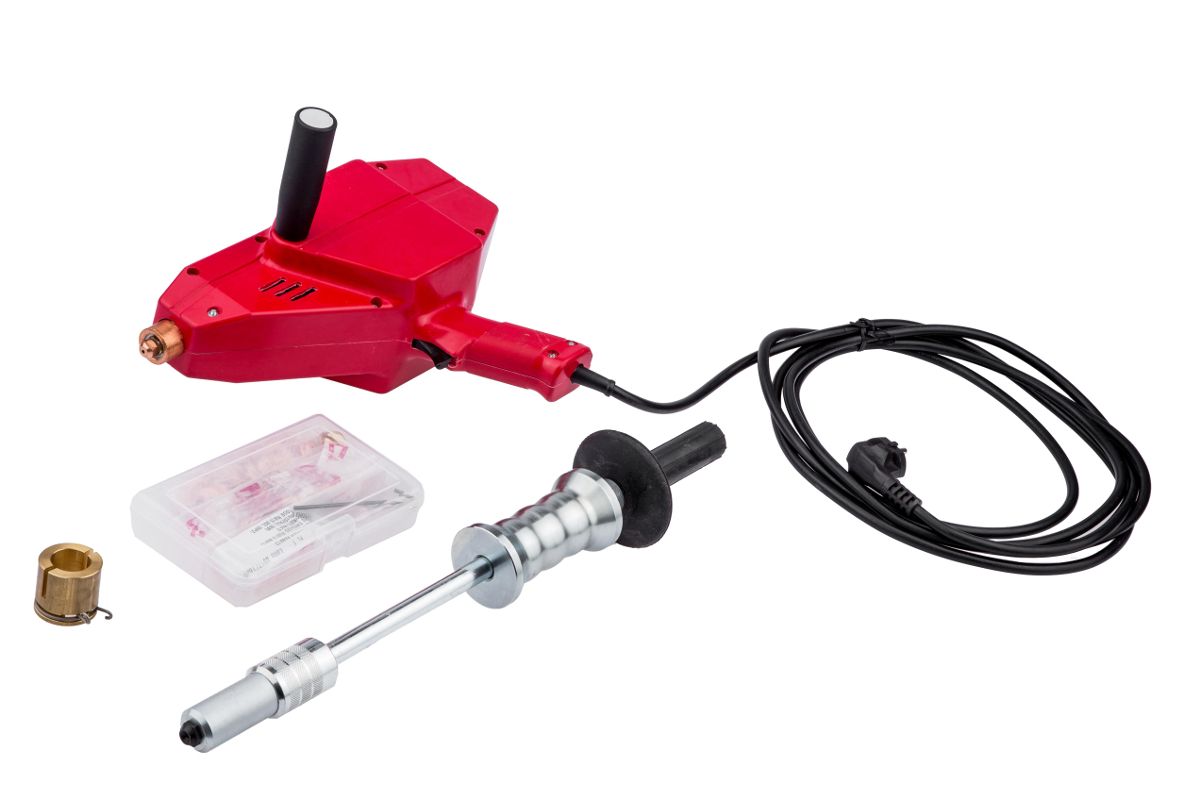 Установка точечной сварки (споттер) предназначена для односторонней контактной точечной сварки встык к листу металла различных крепёжных элементов: шпилек, болтов, шайб, заклёпок, локального нагрева металла специальным электродом, выправления вмятин на деталях кузова автомобиля с помощью ударной насадки.