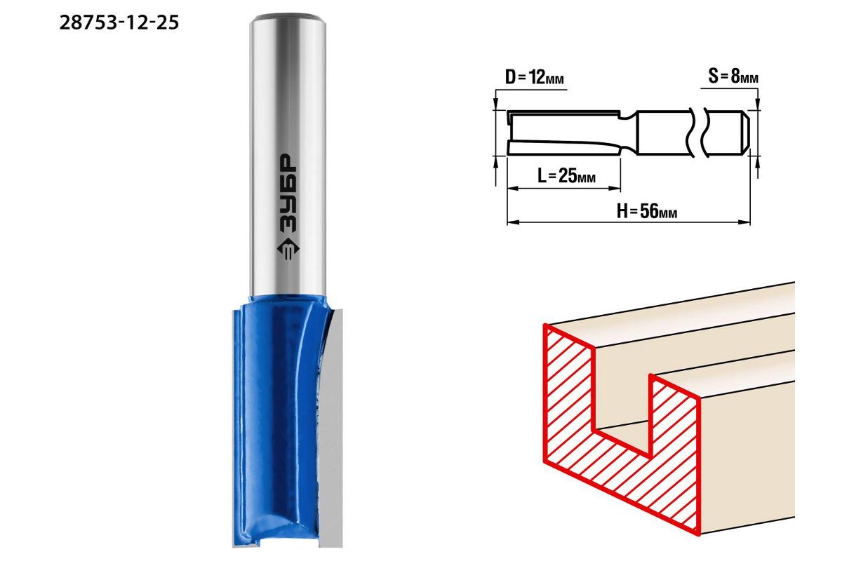 Фреза ЗУБР 28753-12-25 пазовая прямая d= 12мм рабочая длина-25мм хв.-8мм профессионал