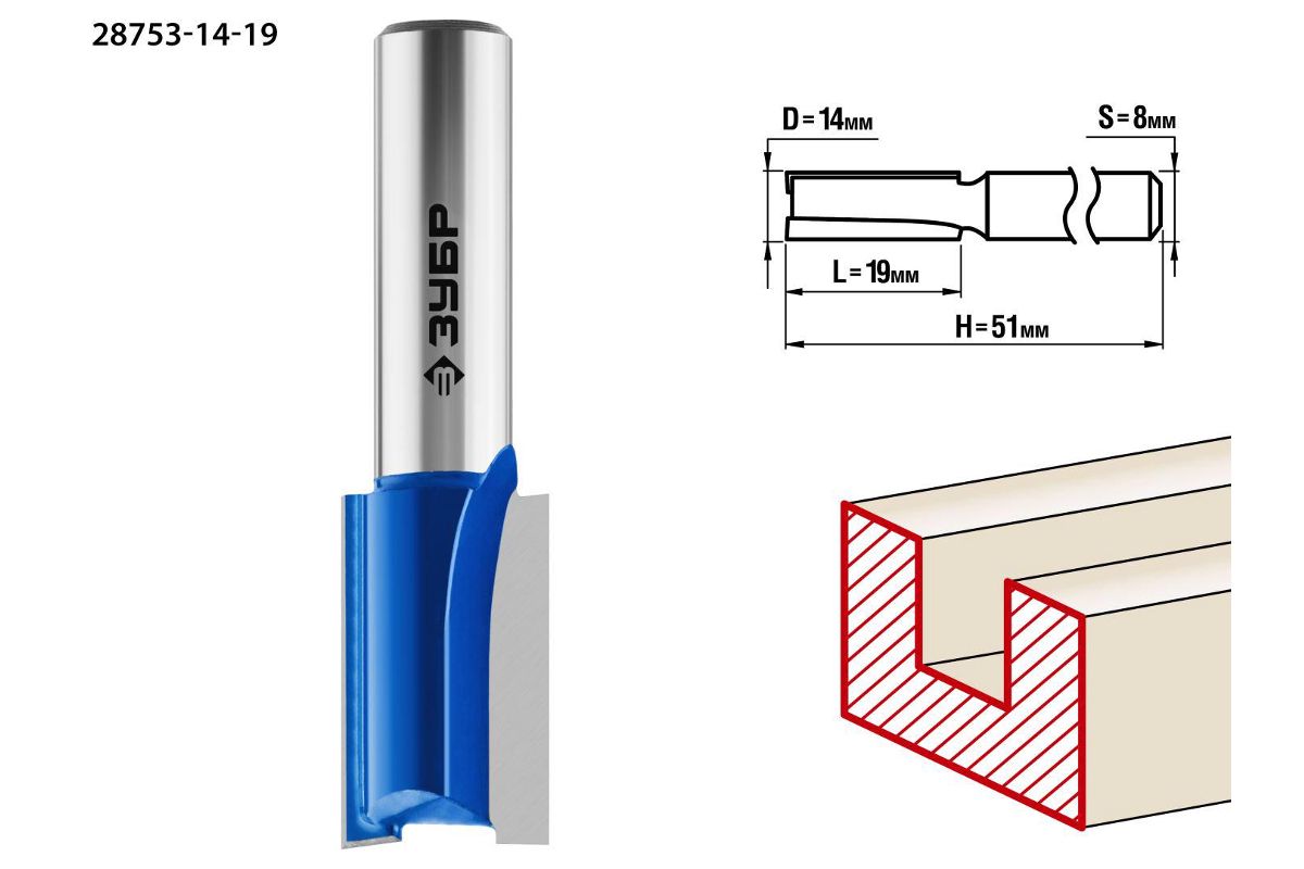 Фреза ЗУБР ''ПРОФЕССИОНАЛ'' 28753-14-19 пазовая прямая, d= 14мм раб.l-19мм хв.-8мм
