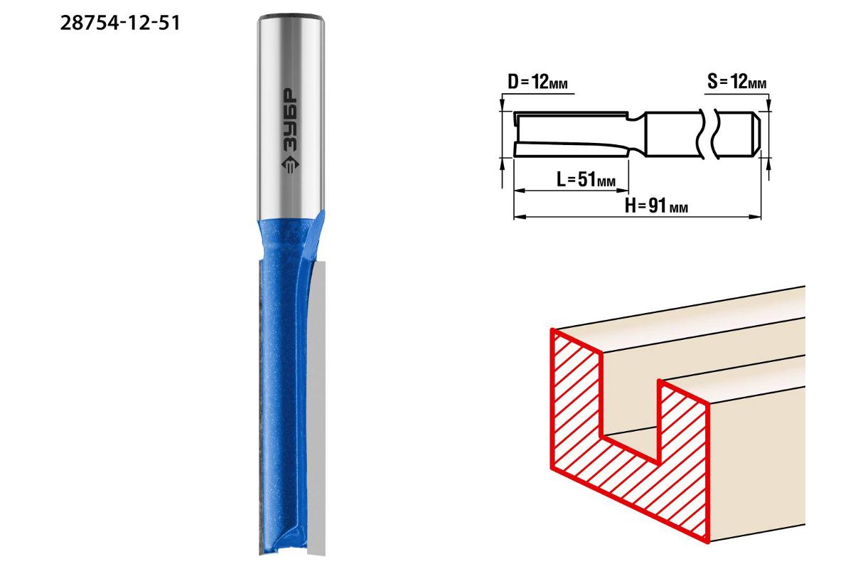 Фреза ЗУБР 28754-12-51 пазовая прямая удлиненная d= 12мм рабочая длина-51мм хв.-12мм профессионал