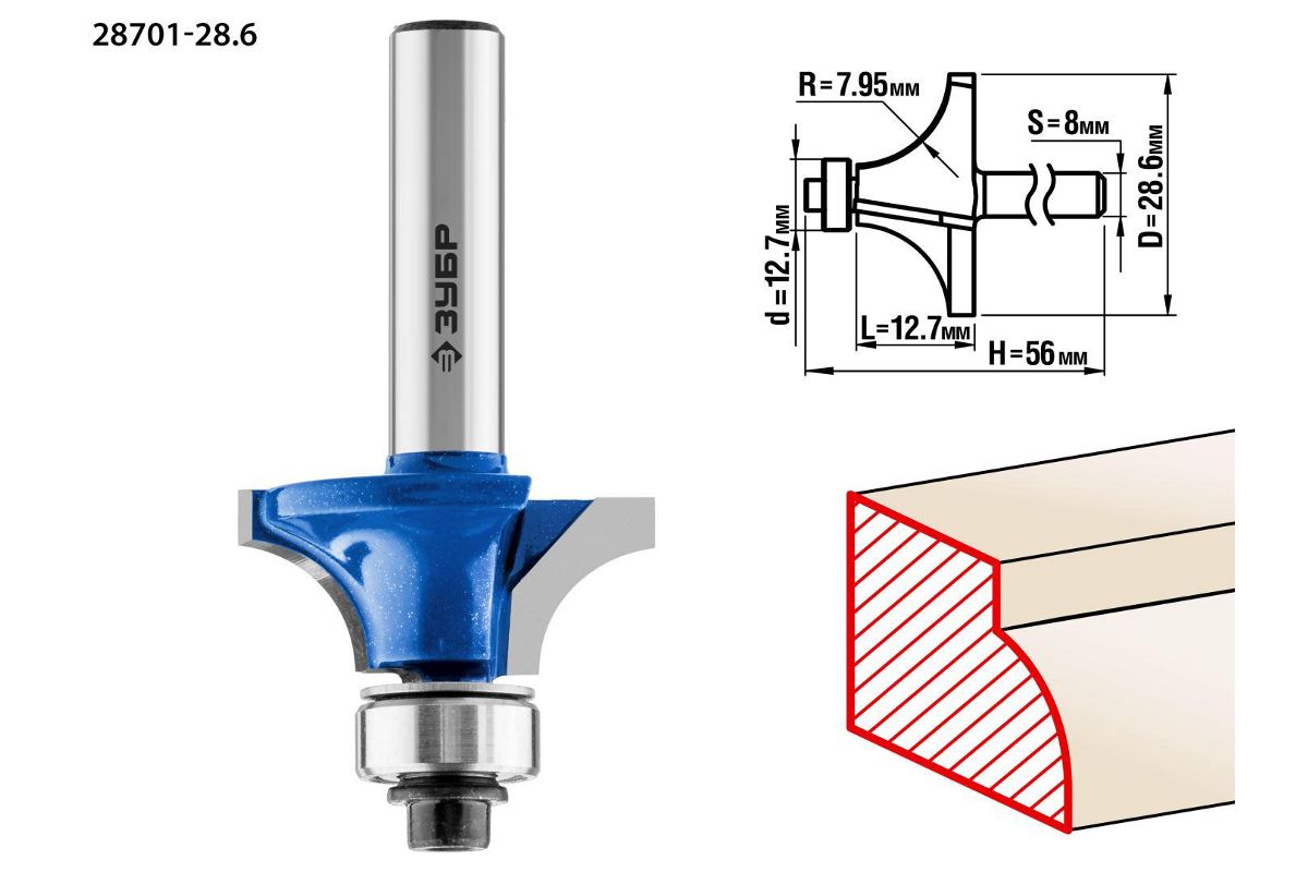 Фреза ЗУБР 28701-28.6 кромочная калевочная №1 d= 28.6мм дл.-12.7мм рад.-7.95мм хв.-8мм d-12.7мм