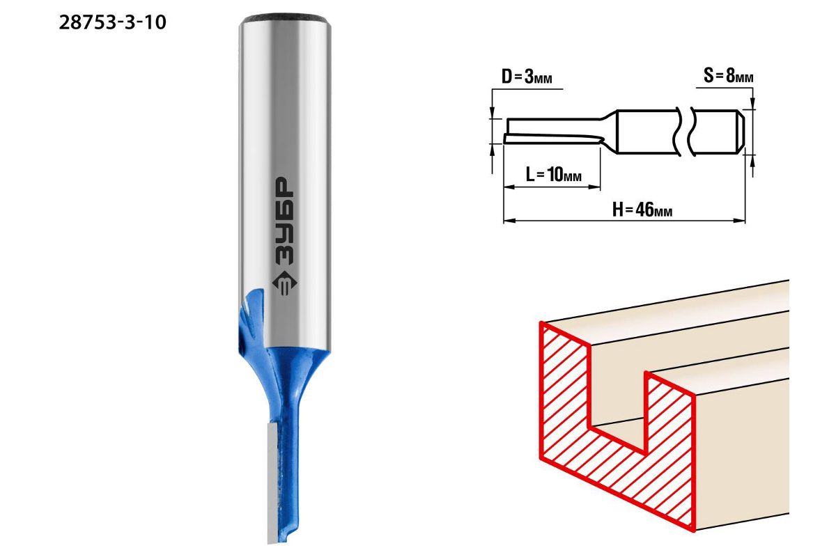 Фреза ЗУБР 28753-3-10 пазовая прямая d= 3мм рабочая длина -10мм хв.-8мм профессионал