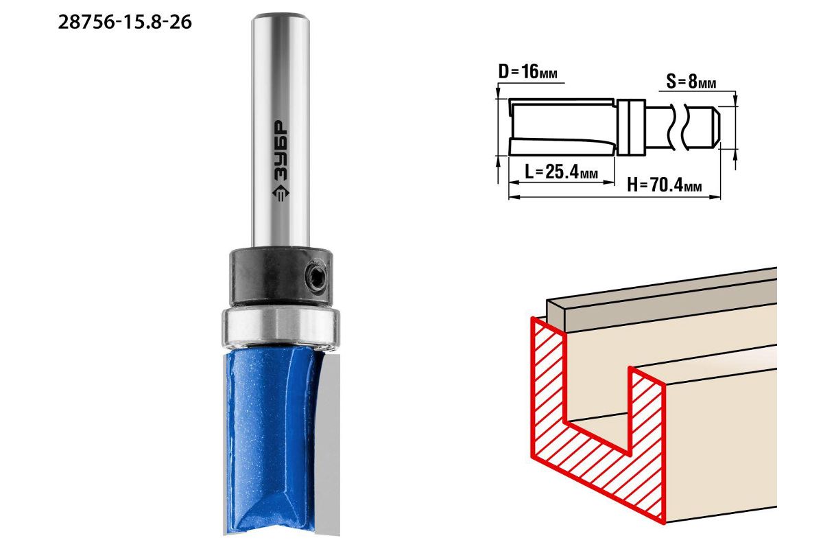 Фреза ЗУБР 28756-15.8-26 пазовая прямая с верхним подшипником d= 16мм дл.-25.4мм хв.-8мм d-15.8мм