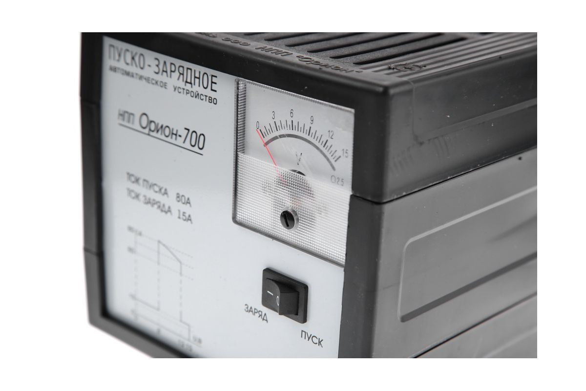ОРИОН PW700 — пуско-зарядное устройство с автоматическим режимом работы. Заряжает автомобильные аккумуляторные батареи разной емкости. Может использоваться как пусковое устройство для завода двигателя автомобиля, мотоцикла. Прибор оснащен системой защиты от перегрева и плавно регулирует силу тока. Пусковой ток — 80А, зарядный — 10А. Номинальное напряжение — 12В.