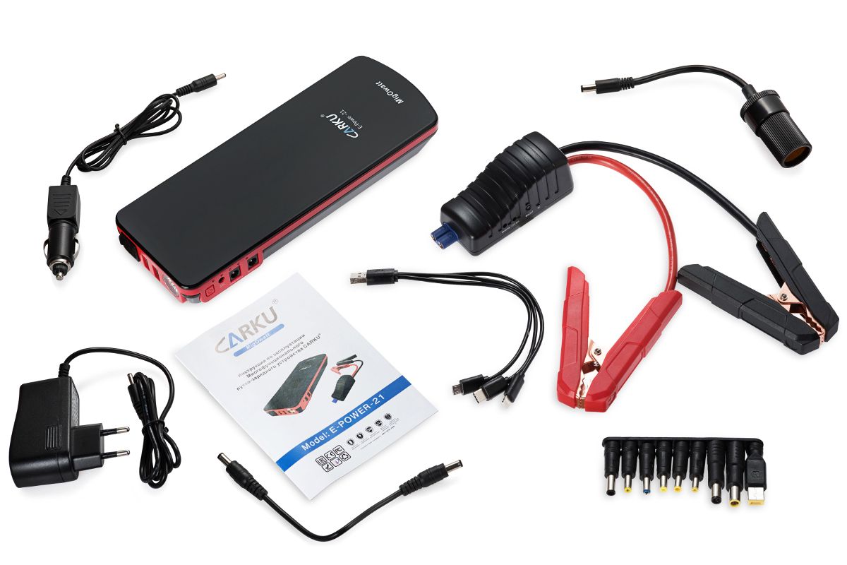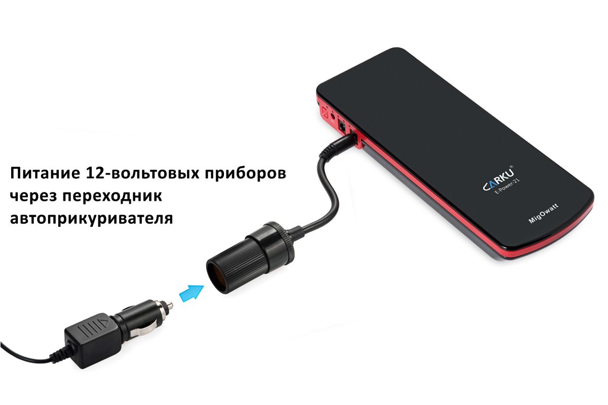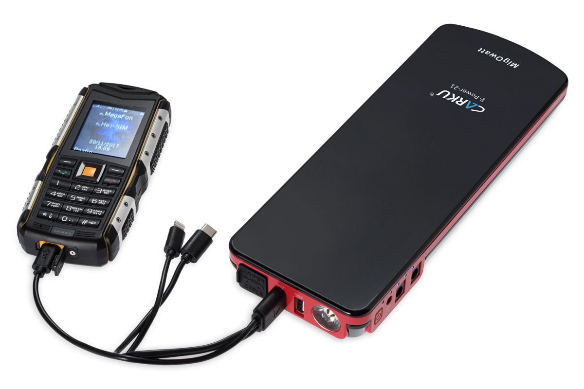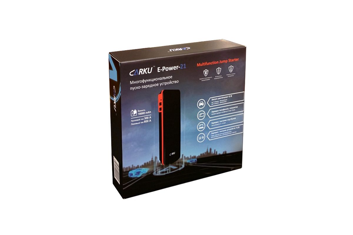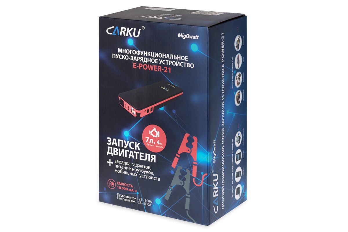 CARKU E-Power-21 – компактное пусковое устройство для автомобильных и мотоциклетных двигателей. Работает в любых климатических условиях. Подходит для бензиновых двигателей до 5 л, для дизельных – до 3 л. Одного заряда хватает на 6-12 зарядок мобильного телефона. Может поддерживать работу ноутбука 3-4 часа.