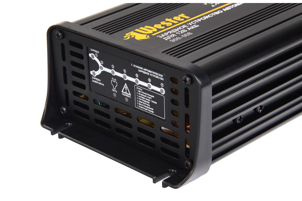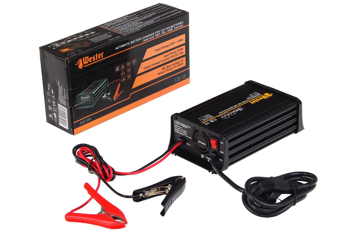 Зарядное устройство WESTER СВ15 — используется для 12-вольтовых аккумуляторов свинцово-кислотного типа (допустимая емкость — до 200 Ач). Без труда восстановит даже полностью разряженный аккумулятор (мин. напряжение — 2 В). Мощность ЗУ — 307 Вт. Макс. выходной ток — 10 А.