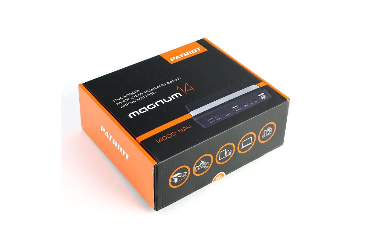 PATRIOT MAGNUM 14 – портативное пусковое устройство, работает в жару и холод, допустимые температуры от -20 до +60°C. Оснащено Li-pol аккумулятором на 14000 мАч. Подходит для авто и мотоциклов. Заряжается от бортовой сети или розетки за 4-5 часов.