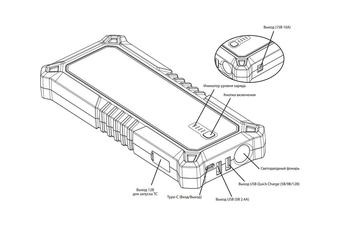 – Зарядка смартфонов и другой портативной электроники через выходы: USB Type-C 60W, USB QuickCharge, USВ 5В/2,4А.
