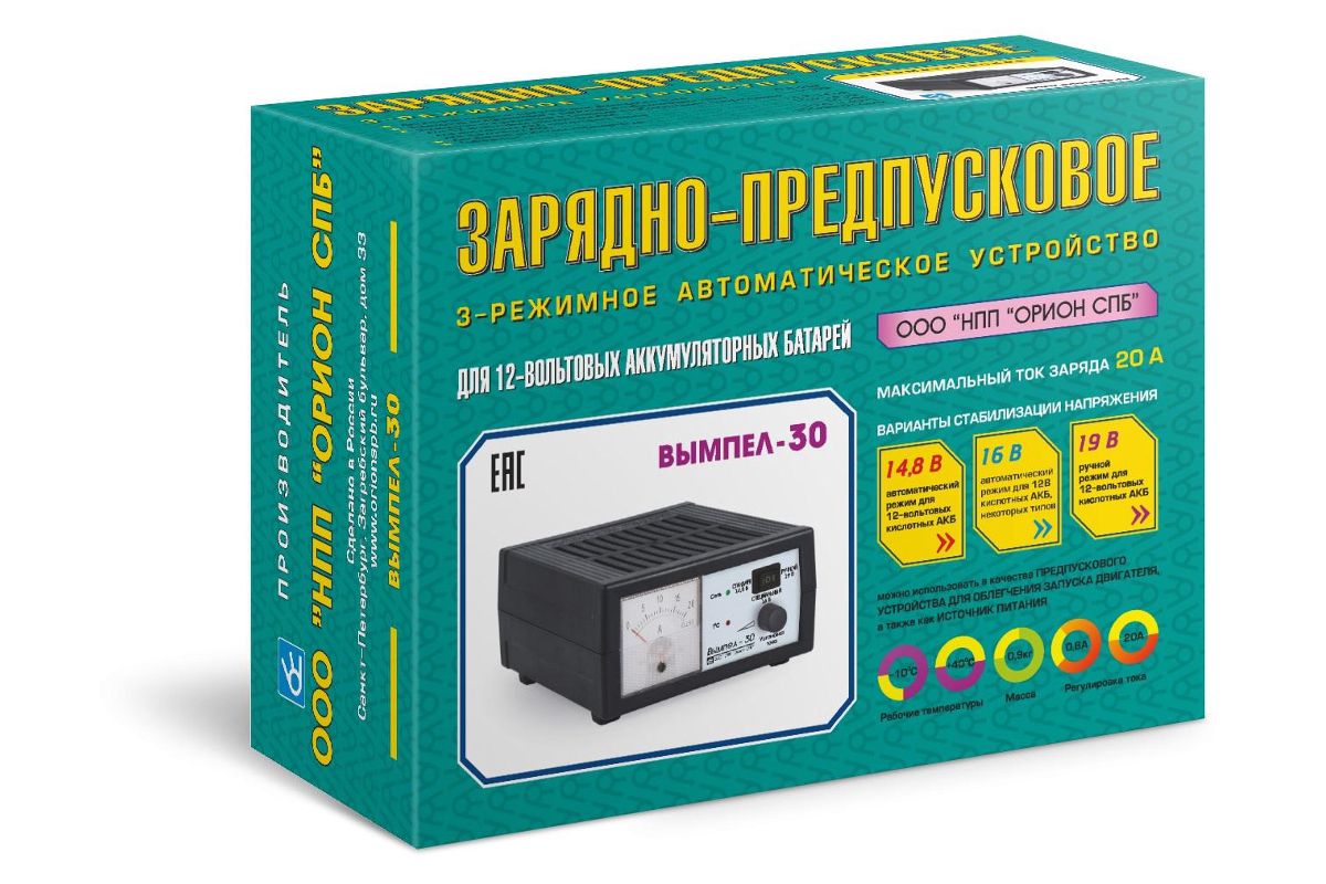 Зарядное устройство ОРИОН Вымпел-30 предназначено для работы с 12В аккумуляторами. По окончании зарядки сила тока уменьшается, а затем устройство переходит в нерабочий режим до следующего использования. Устройство можно использовать для облегчения запуска двигателя.