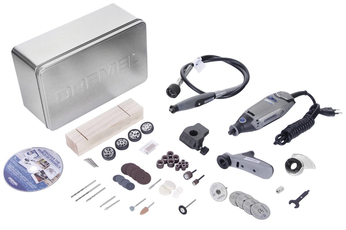 45 насадок в комплекте позволят воплотить любой творческий замысел и/или справиться с любой несложной бытовой задачей. Благодаря инновационному наконечнику EZ Twist на смену насадок уходят считанные секунды (ключ не требуется). Также в наборе: гибкий вал, деревянная заготовка и колесики для изготовления игрушечной машинки, приспособление Comfort Guard (насадка для защиты от пыли и искр). Для хранения и транспортировки имеется прочный и легкий жестяной кейс. Инструмент удобен в работе благодаря компактному корпусу и дополнительной рукоятке.