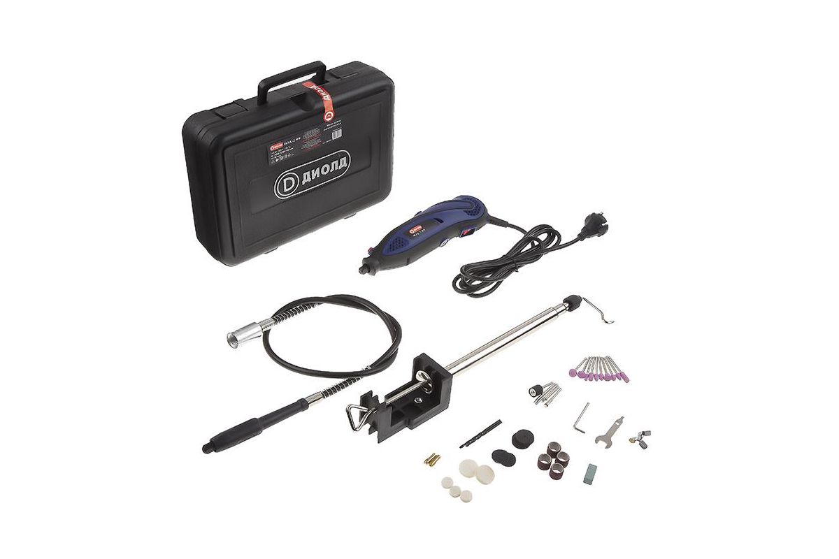 ДИОЛД МЭД-2 МФ – мини-дрель для обработки дерева, кости, камня и металла. Мощность 150 Вт. Пригодится для производства миниатюрных отверстий, фрезерования деревянных заготовок, нанесения декоративных украшений и т.д.