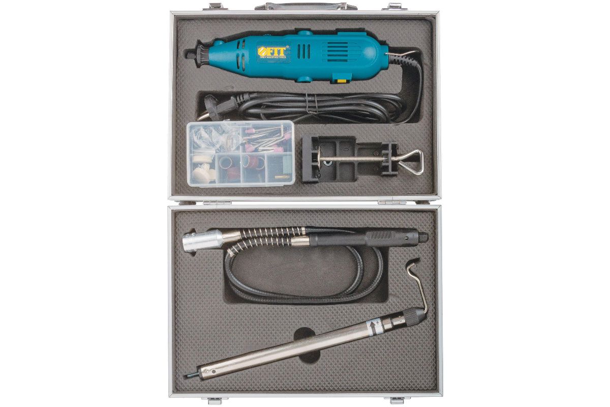 Гравировальная машина FIT 80592 предназначена для применения в быту. Модель оснащена двухпозиционным переключателем, благодаря чему нет необходимости постоянно держать палец на клавише ''Пуск''. Корпус имеет особое покрытие для предотвращения выскальзывания из рук. Инструмент вместе с комплектом оснастки и аксессуаров поставляется в удобном кейсе, который защищает набор от ударов при транспортировке.