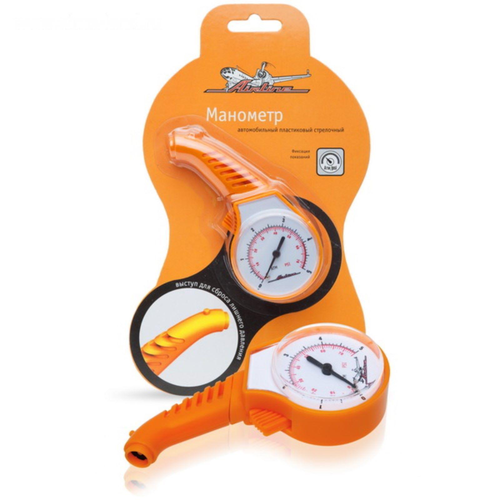 Устройство для измерения давления в шинах автомобиля. Манометр имеет лёгкий корпус с ярким окрасом. На корпусе присутствует специальный выступ для сброса лишнего давления в шине. При измерении давления показания манометра фиксируются - это удобно при работе в труднодоступных местах. Для сброса показаний необходимо нажать на кнопку, расположенную на корпусе.