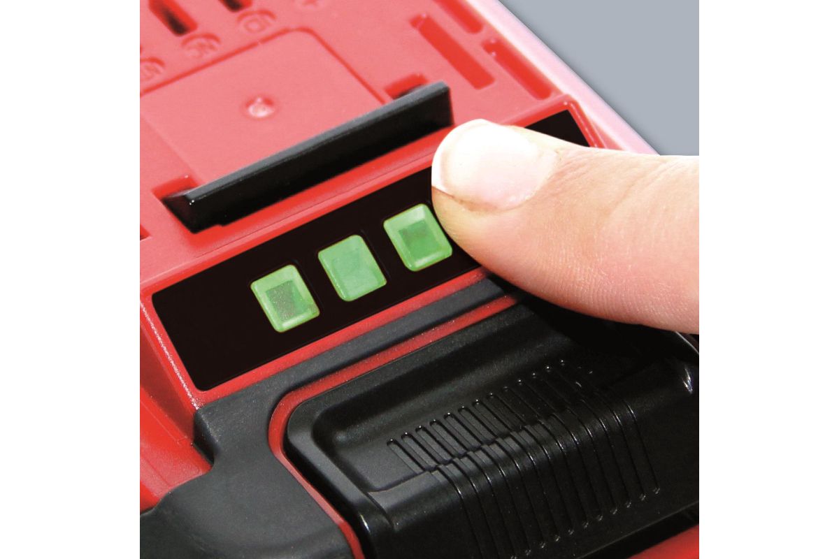 Высококачественная аккумуляторная батарея устойчива к эффекту памяти и саморазряду. Уровень заряда можно проверить на 3-х ступенчатом светодиодном индикаторе. Утопленная ручка позволяет легко извлекать аккумулятор из любого инструмента.