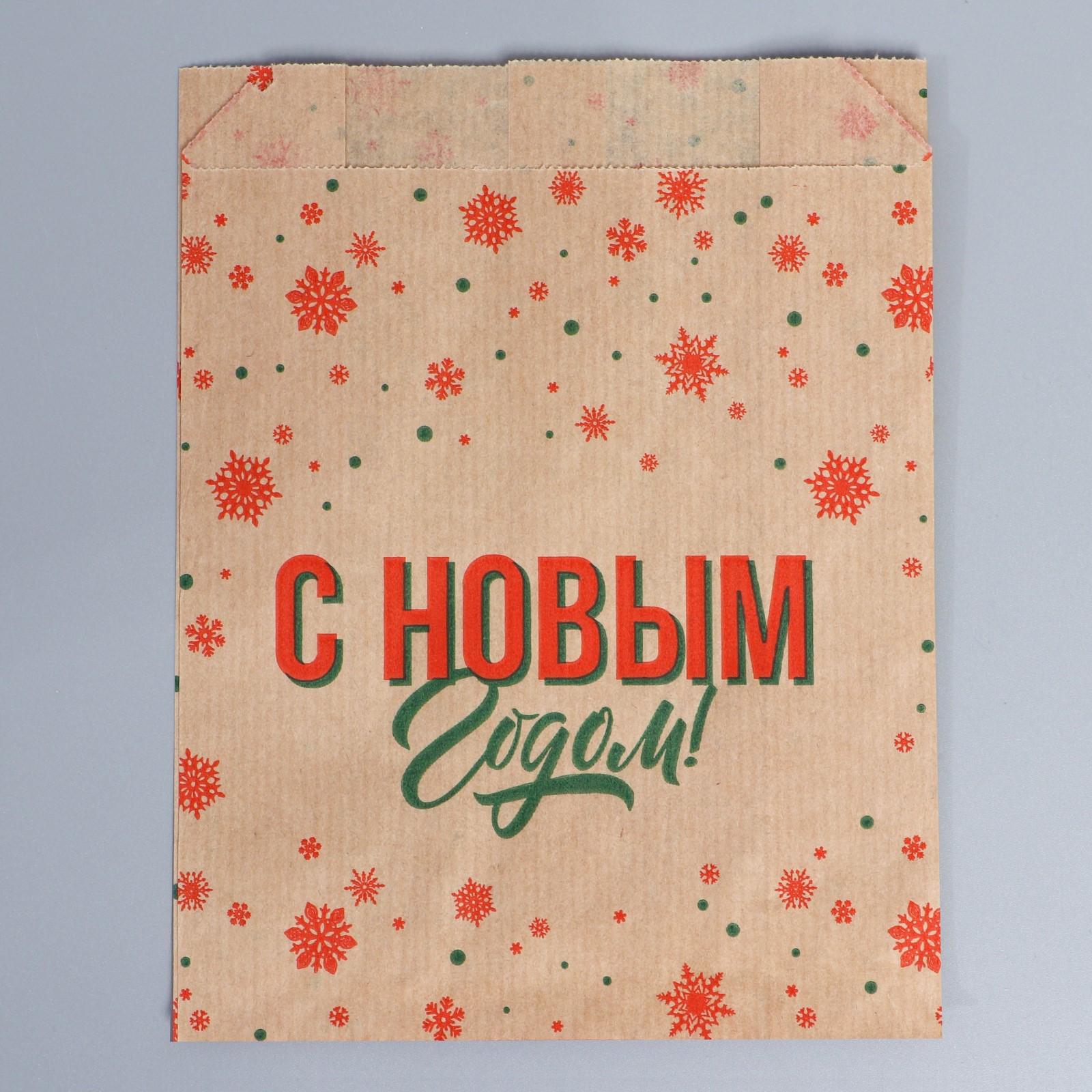 Пакет бумажный фасовочный, крафт, V-образное дно «С Новым Годом!», 16,8 х 13,5 х 5,5 см