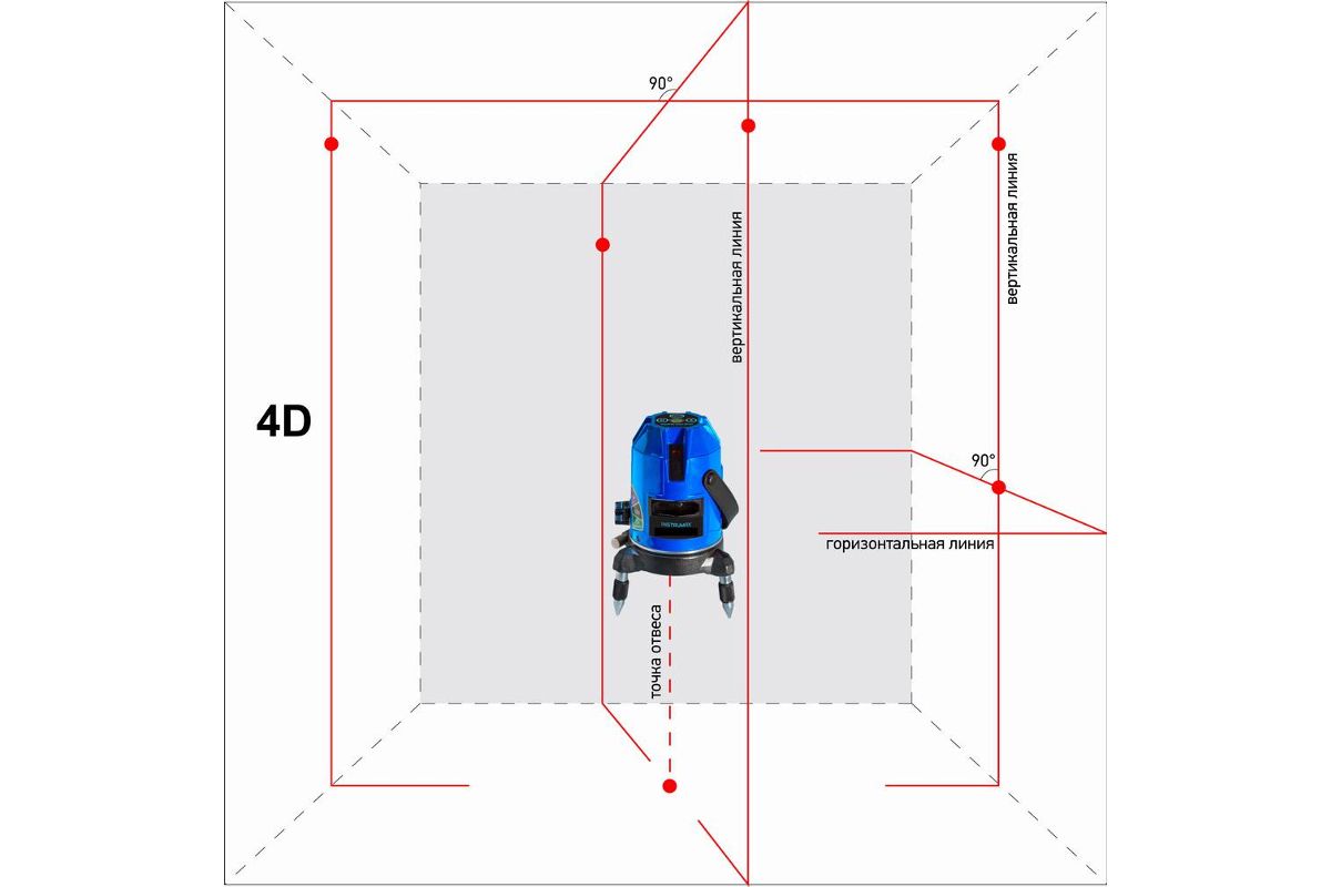 Лазерный уровень Instrumax CONSTRUCTOR 4D SET — это точный линейный лазерный уровень, предназначенный для работ внутри помещений и на улице. Instrumax CONSTRUCTOR 4D SET строит 4 вертикальные линии (4V), 1 горизонтальную (Н), точку отвеса (D). Дополнительно на пересечении вертикальной и горизонтальной линии и на вертикале чуть выше сделаны лазерные точки. На большом расстоянии, когда лазерные лучи плохо видно, точки помогают обнаружить их.