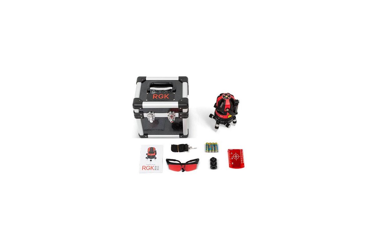 RGK UL-41 — функциональный лазерный уровень с высоким уровнем точности (0,2 мм на метр). Прибор строит 4 вертикальные линии и 1 горизонтальную. Благодаря этому проекции охватывают все стены помещения. Дальность действия — 20 м, а с приемником — вплоть до 60 м. Поворотный корпус с лимбом упрощает перенос проекции. Винты плавной настройки и пузырьковый уровень помогают выровнять устройство. В комплекте предусмотрена мишень и лазерные очки.