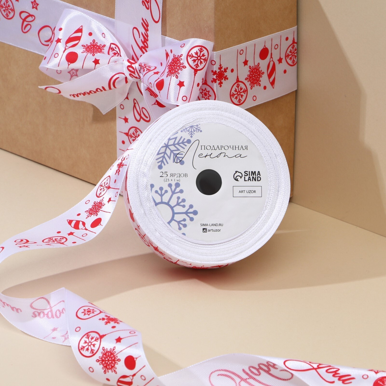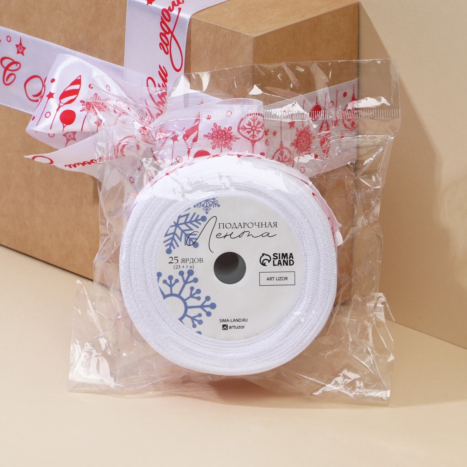 Лента атласная «С Новым годом», белая, 4 см × 25 ярдов (22,5 м)