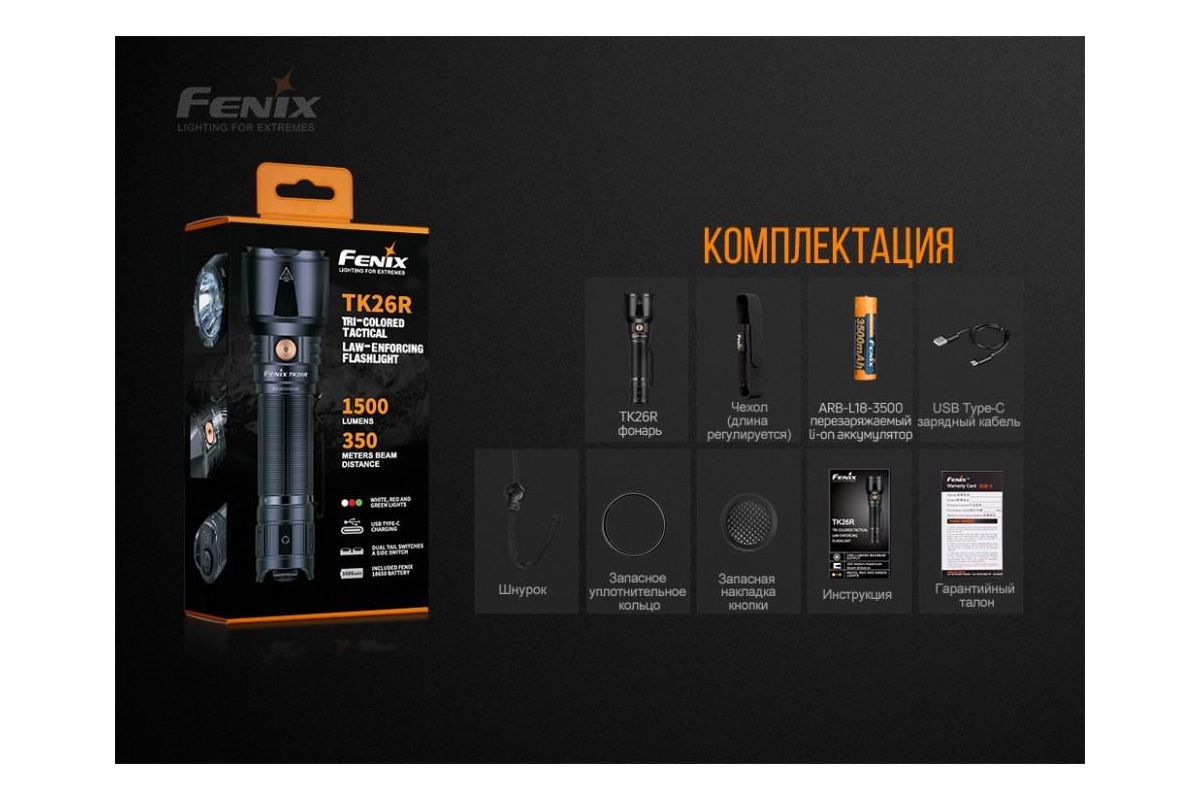 Комплектация: Фонарь, аккумулятор Fenix ARB-L18-3500, кабель USB Type-C, ремешок на руку, чехол, запасное уплотнительное кольцо, инструкция, гарантийный талон.