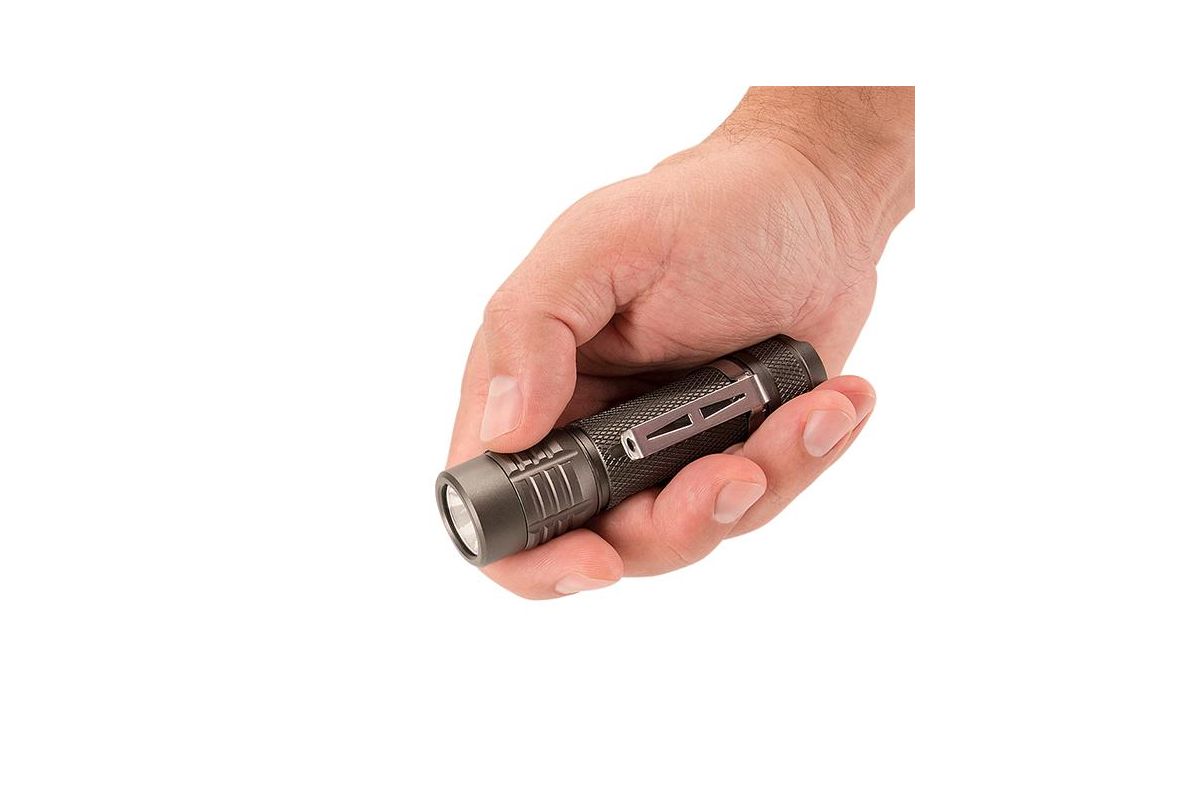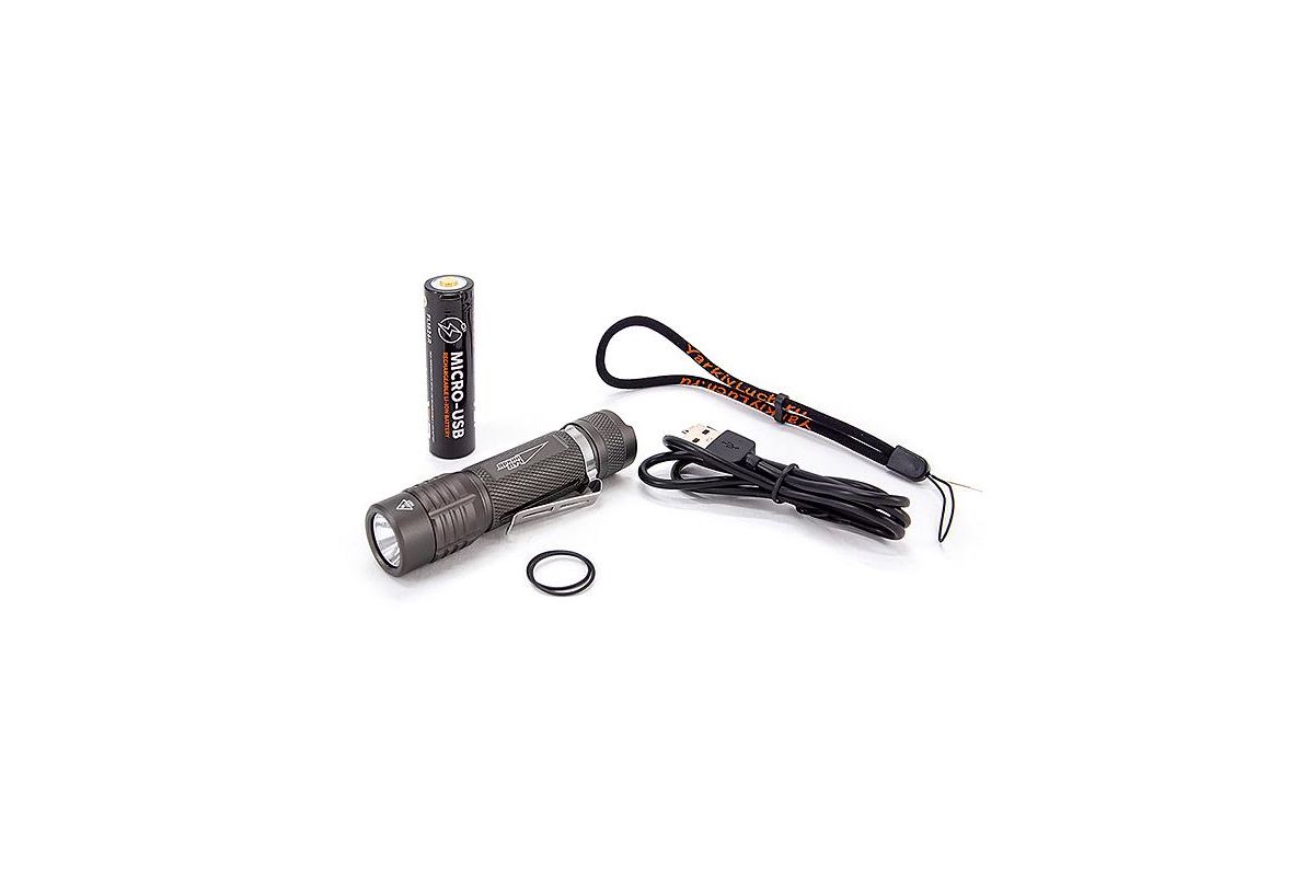 Универсальный фонарь имеет особенности: светодиод Nichia 219D, теплый белый свет 3000 К, защищённый Li-Ion аккумулятор 18650 высокой емкости 2600 мАч с портом micro- USB и индикаторами процесса заряда (входит в комплект), пять основных режимов яркости: 10, 50, 160, 320 и 900 лм, скрытый режим moonlight 0.5 лм., память режимов, дополнительный тактический интерфейс, влагозащита IPX8.
