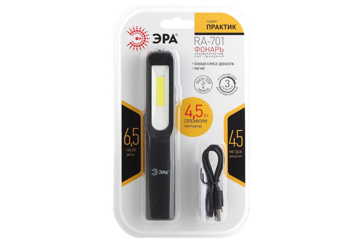 Фонарь ЭРА RA-701 Практик (Б0039623) [ЗВт COB, 3Вт LED, магнит, клипса-держатель, micro USB, 1200m