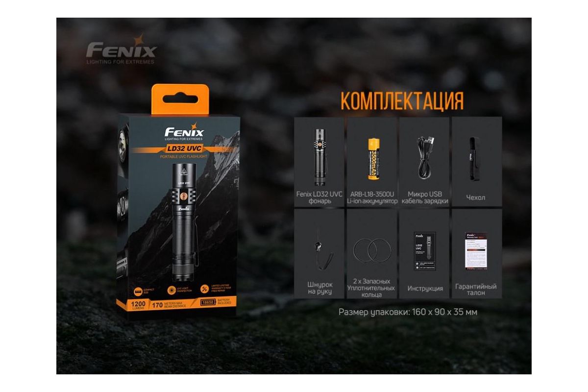 Комплектация: Фонарь Fenix LD32 UVC, аккумулятор ARB-L18-3500U Li-ion, кабель Micro USB, клипса, ремешок, чехол, 2 запасных уплотнительных кольца, инструкция, гарантийный талон.