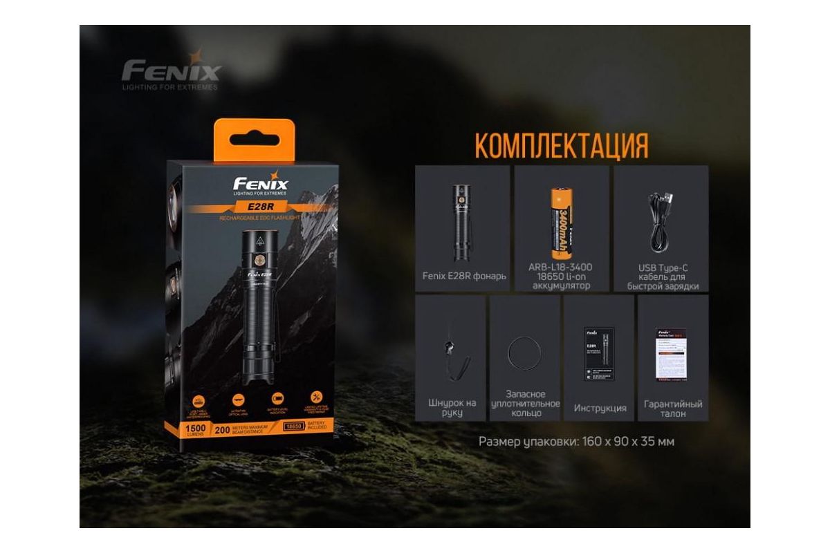 Комплектация: Фонарь Fenix E28R, аккумулятор ARB-L18-3400 18650, кабель быстрой зарядки USB Type-C, ремешок, запасное уплотнительное кольцо, инструкция, гарантийный талон.