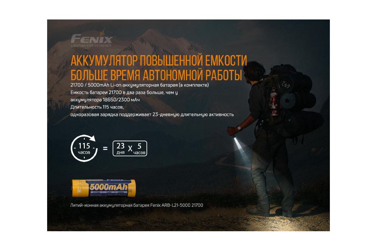 PD36R работает от одного 21700 Li-ion аккумулятора емкостью 5000 мАч, который поставляется в комплекте. Аккумулятор заряжается в фонаре через порт USB Type-C.