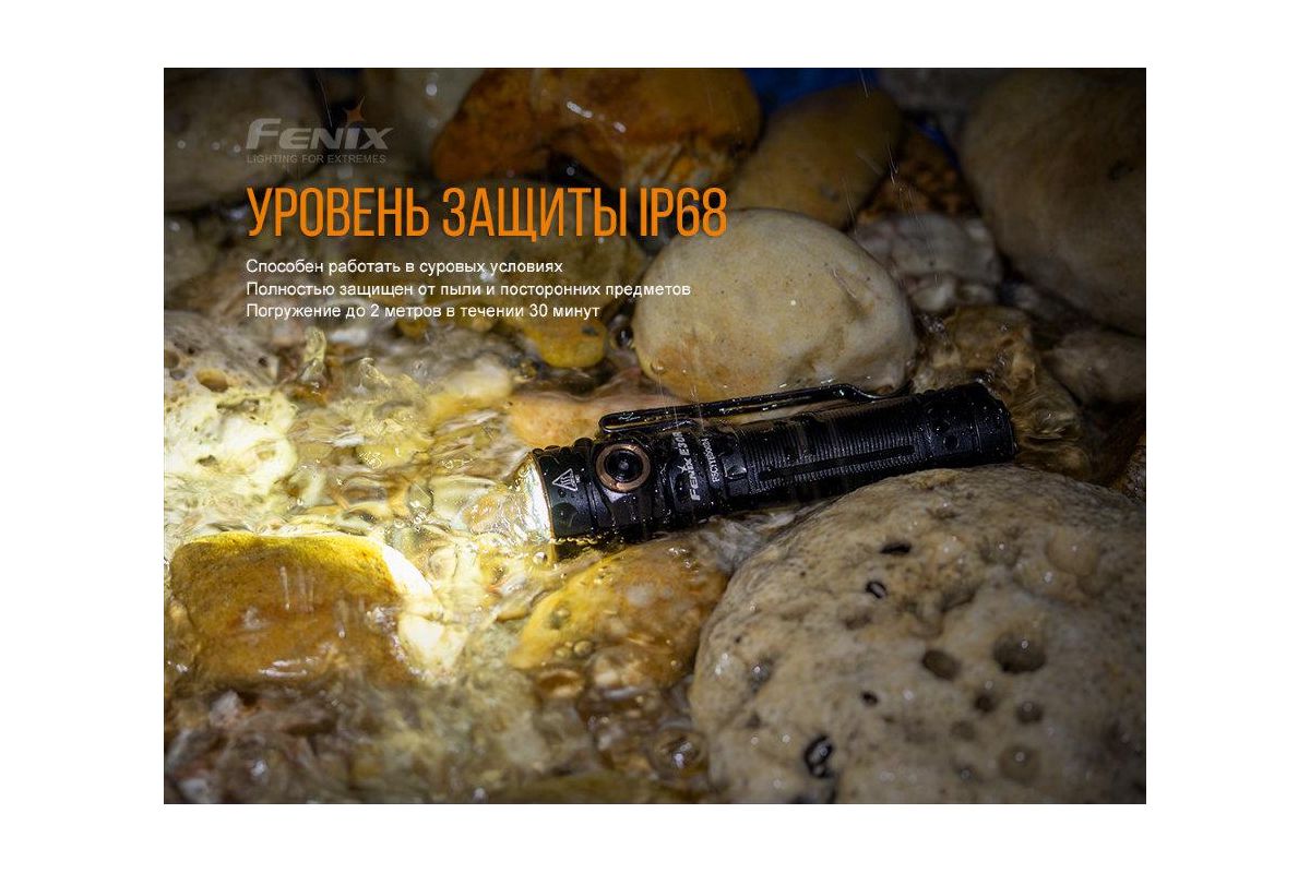Корпус фонаря выполнен из высокопрочного алюминия с покрытием премиальным анодированием, предупреждающим окисление и износ. E30R полностью водонепроницаем и выдерживает погружение до 2 метров.