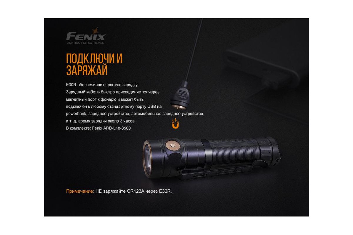 Fenix E30R работает как от одного литий-ионного аккумулятора 18650 (в комплекте), так и от двух морозоустойчивых литиевых батарейки CR123A. Магнитная зарядка позволяет быстро и надежно зарядить фонарь без разбалтывания контактов и проникновения внутрь разъема инородных частиц и влаги.