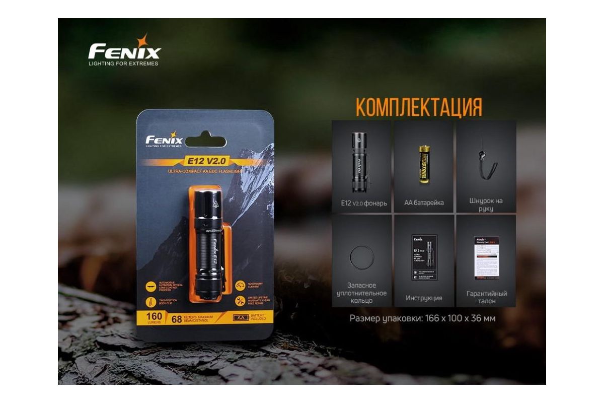Комплектация: Фонарь E12 V2.0, батарейка AA, запасное уплотнительное кольцо, ремешок, инструкция, гарантийный талон.