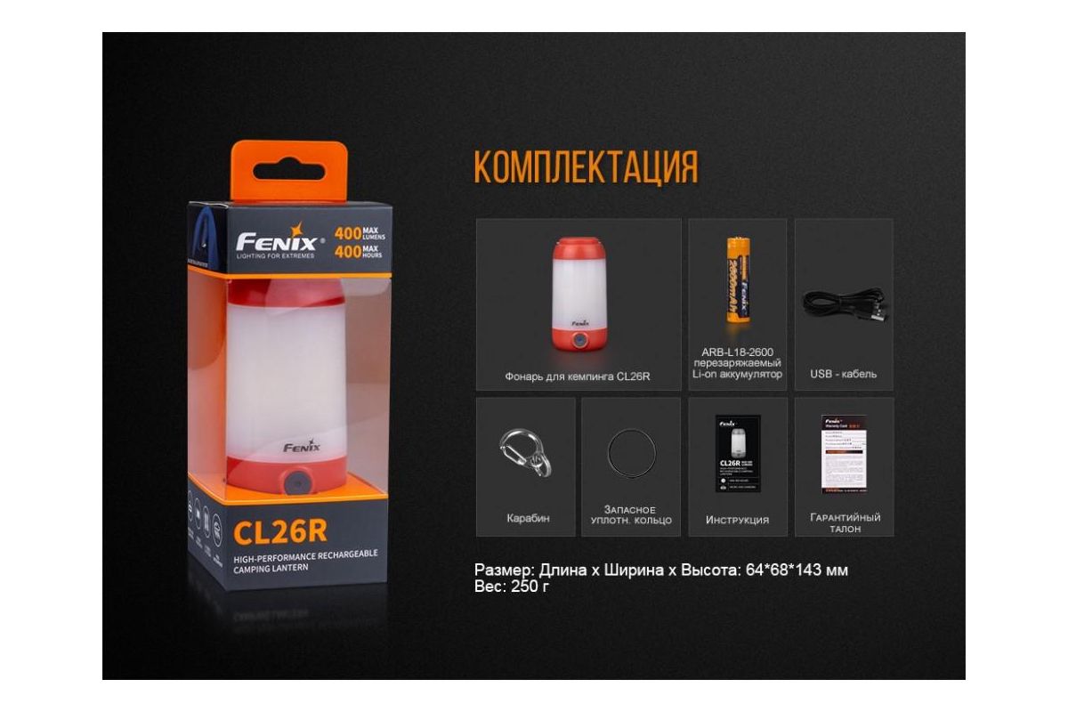 Комплектация: Фонарь CL26R, запасное уплотнительное кольцо, аккумулятор Fenix ARB-L18-2600 Li-ion, карабин, кабель для зарядки, инструкция, гарантийный талон.
