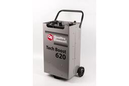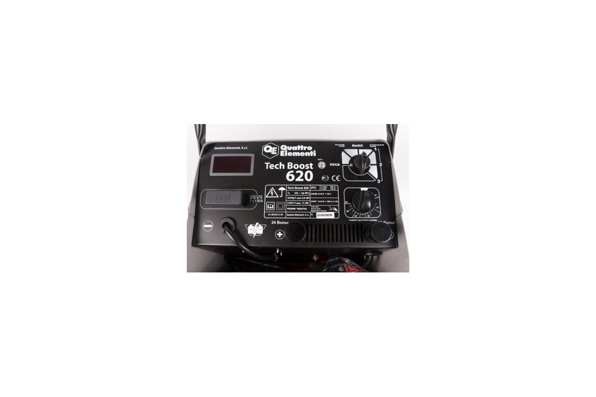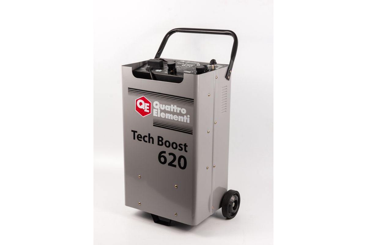 QUATTRO ELEMENTI Tech Boost 620 — пуско-зарядное устройство для автосервисов, СТО, стоянок. Заряжает свинцово-кислотные и гелевые АКБ с напряжением 12 и 24 Вольт. Пиковый ток зарядки — 90А. Пиковый ток запуска — 590А. Подойдет для автомобилей, мотоциклов, автобусов, грузовиков. Используется для запуска бензиновых и дизельных двигателей внутреннего сгорания. Габариты: 61 см х 41 см х 31 см