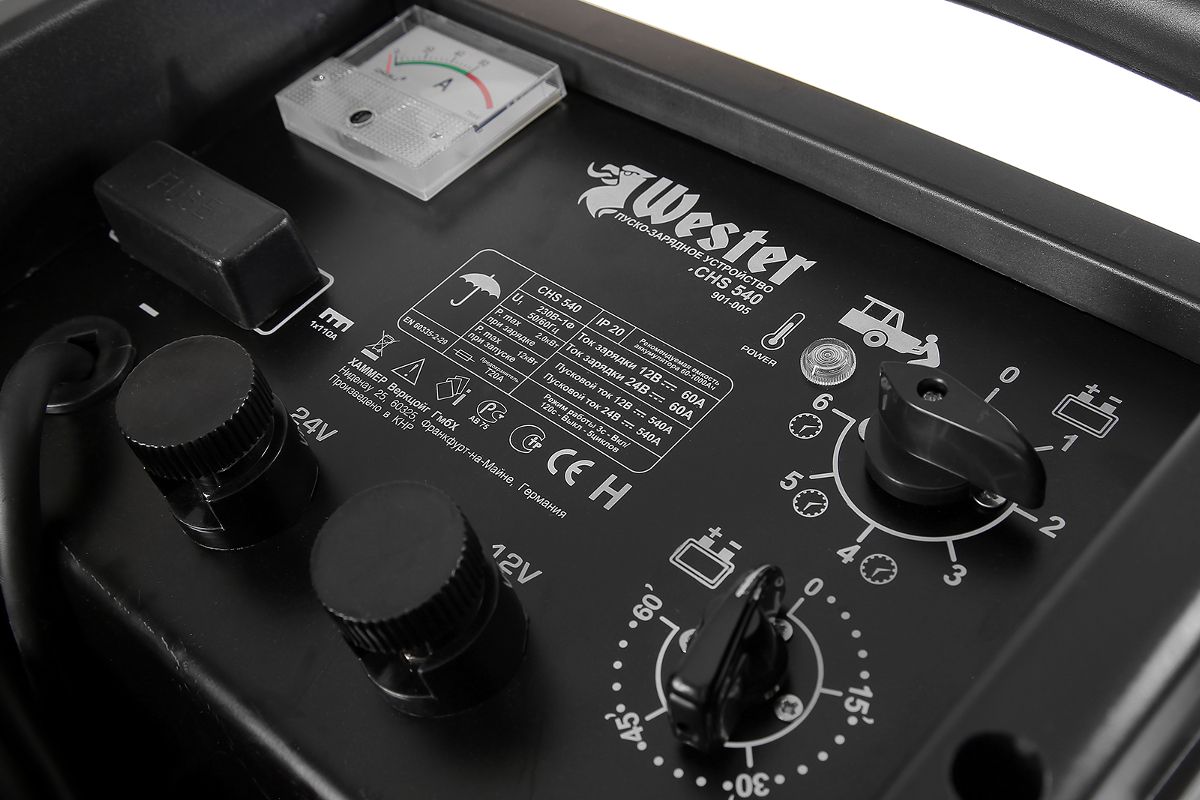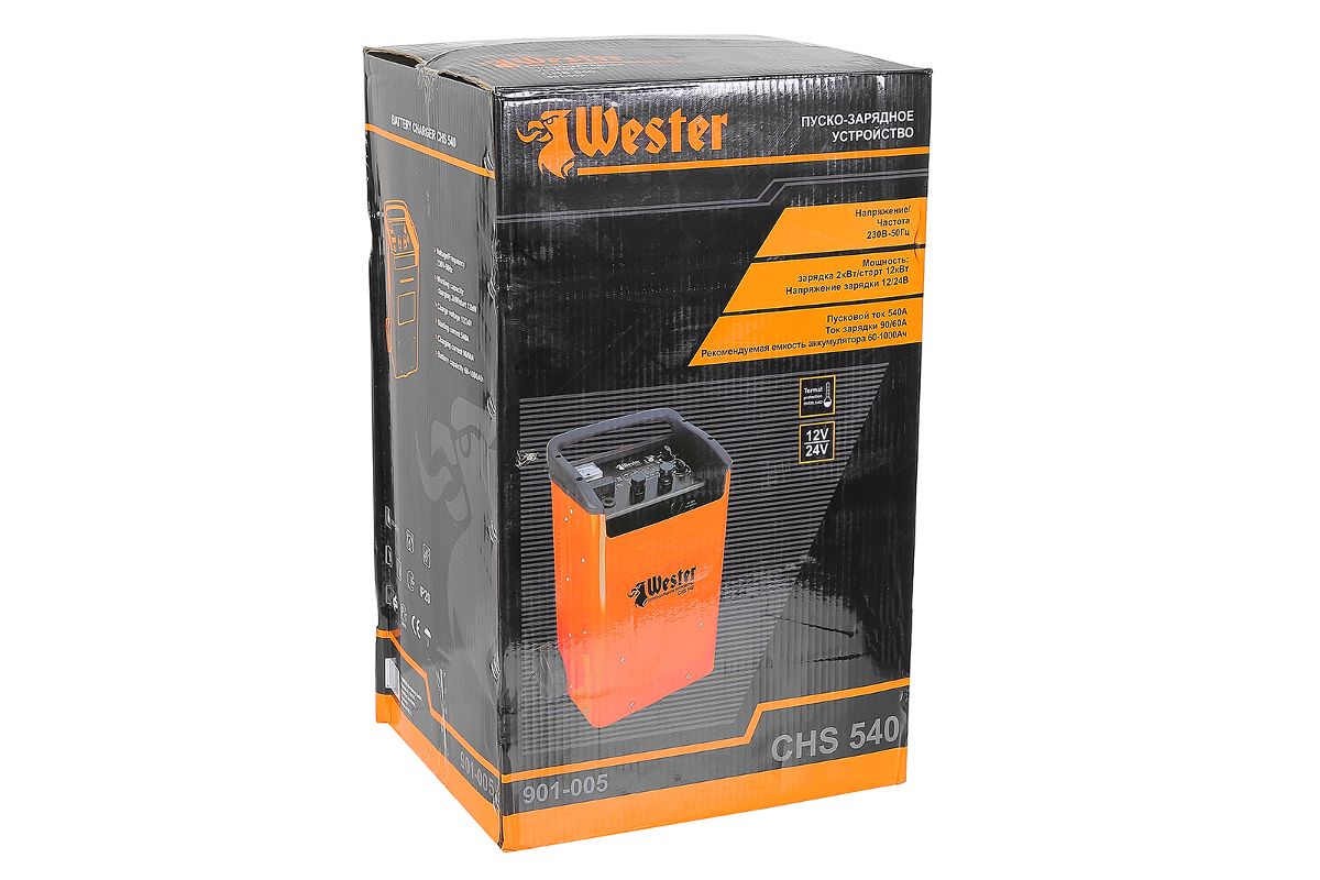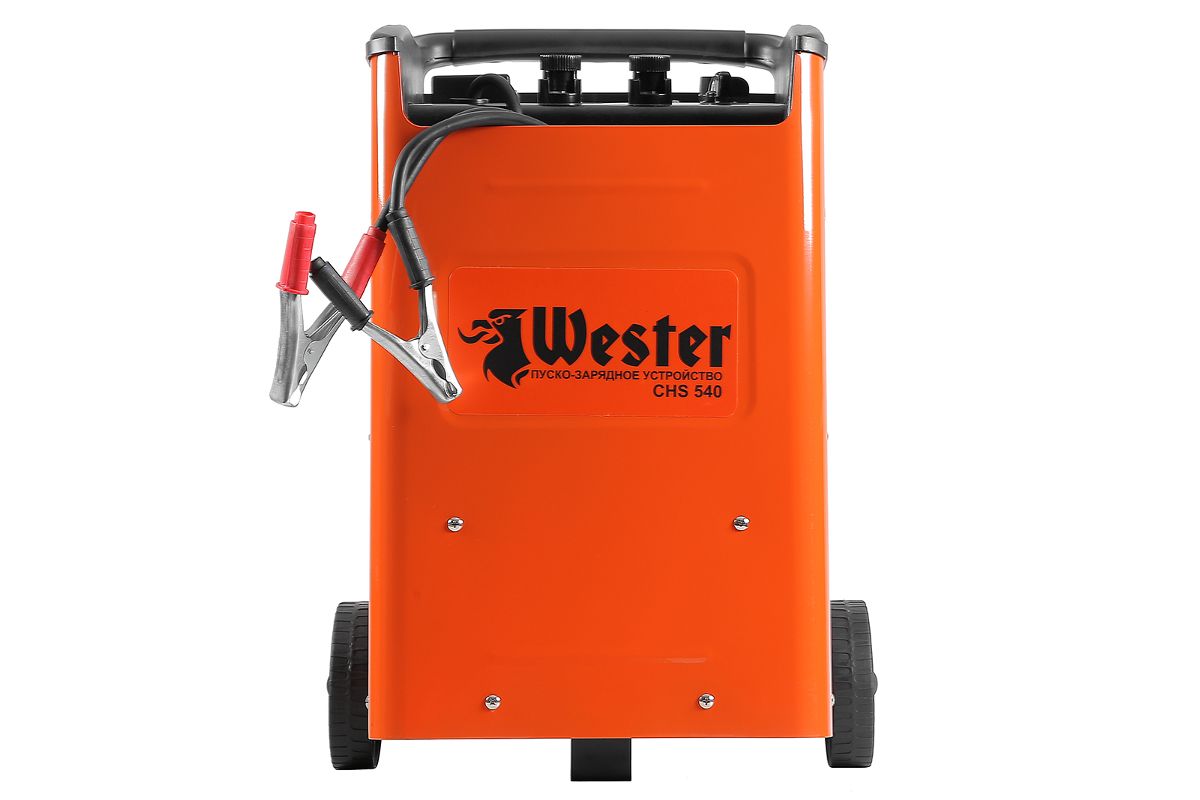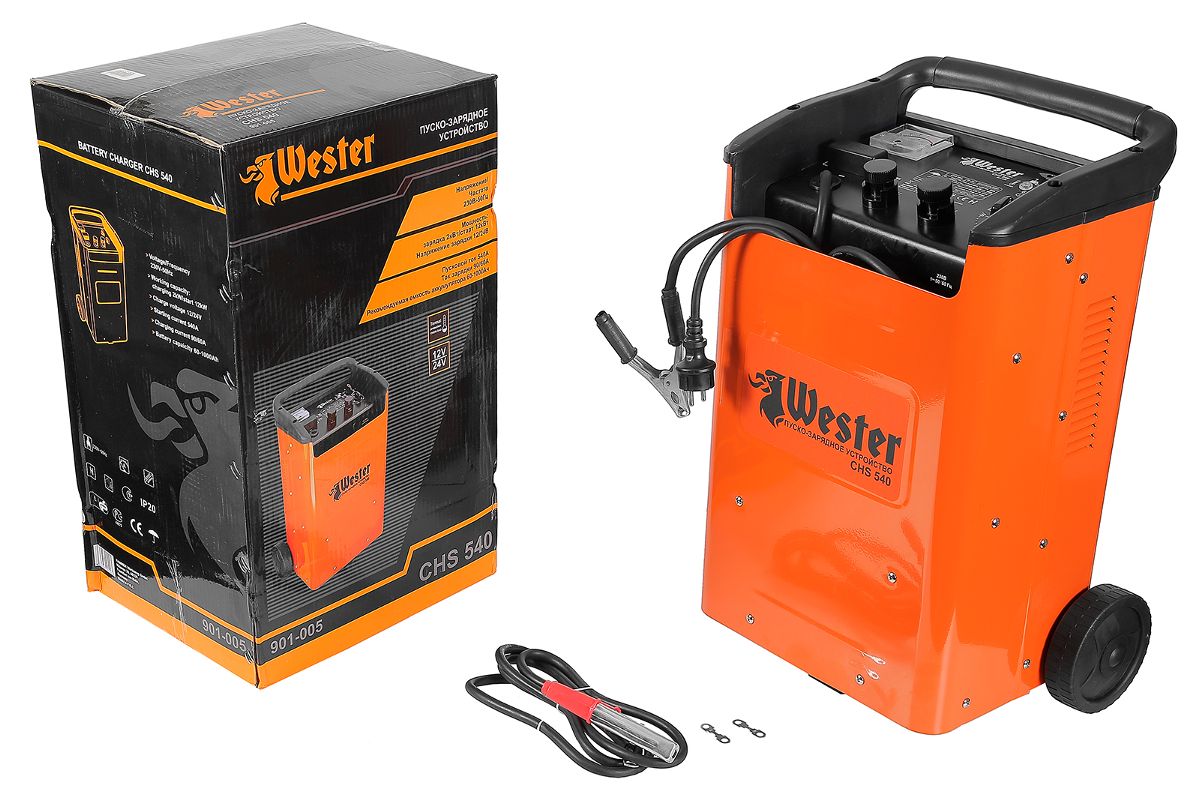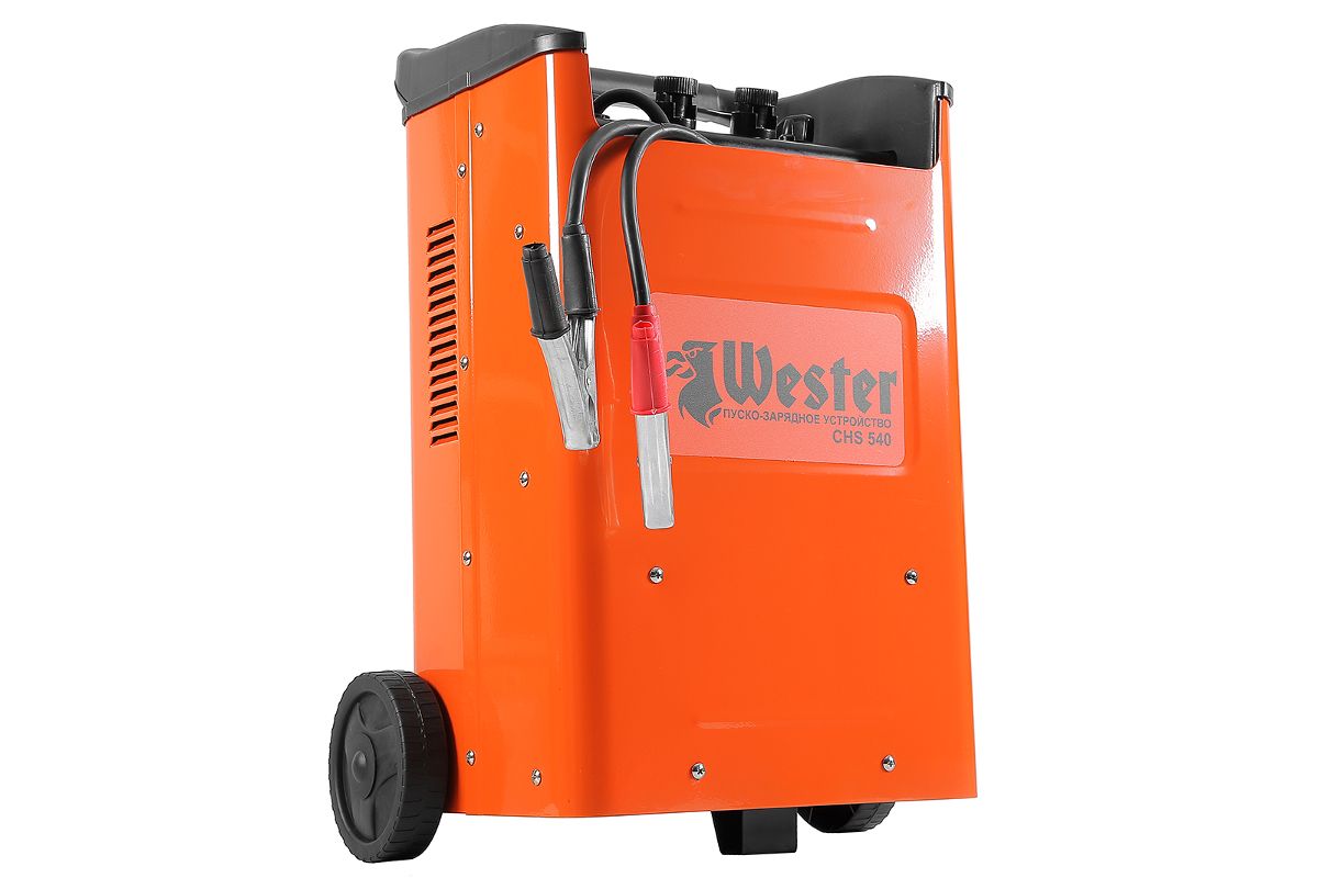 Пуско-зарядное устройство WESTER CHS540 — служит для зарядки свинцово-кислотных аккумуляторных батарей, также используется для запуска двигателей транспортных средств. Часто встречается в арсенале мастеров сервисных центров или автопарка. Допустимая емкость — от 60 до 1000 Ач. Мощность — 12000 Вт. Прибор мобилен, прост в эксплуатации и неприхотлив в уходе.
