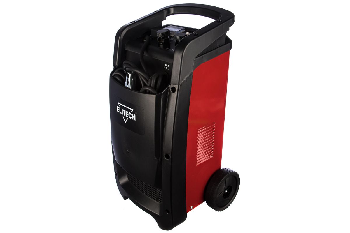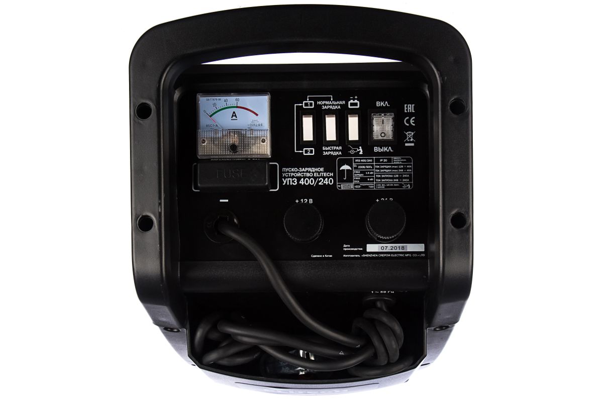 ELITECH УПЗ 400/240 — пуско-зарядное устройство для автосервисов, станций ТО, частного применения. Подходит для заряда аккумуляторов автомобилей, мотоциклов, запуска двигателей. Выходное напряжение — 12/24 Вольт. Максимальный ток заряда — 40А. Максимальный ток пуска — 240А.