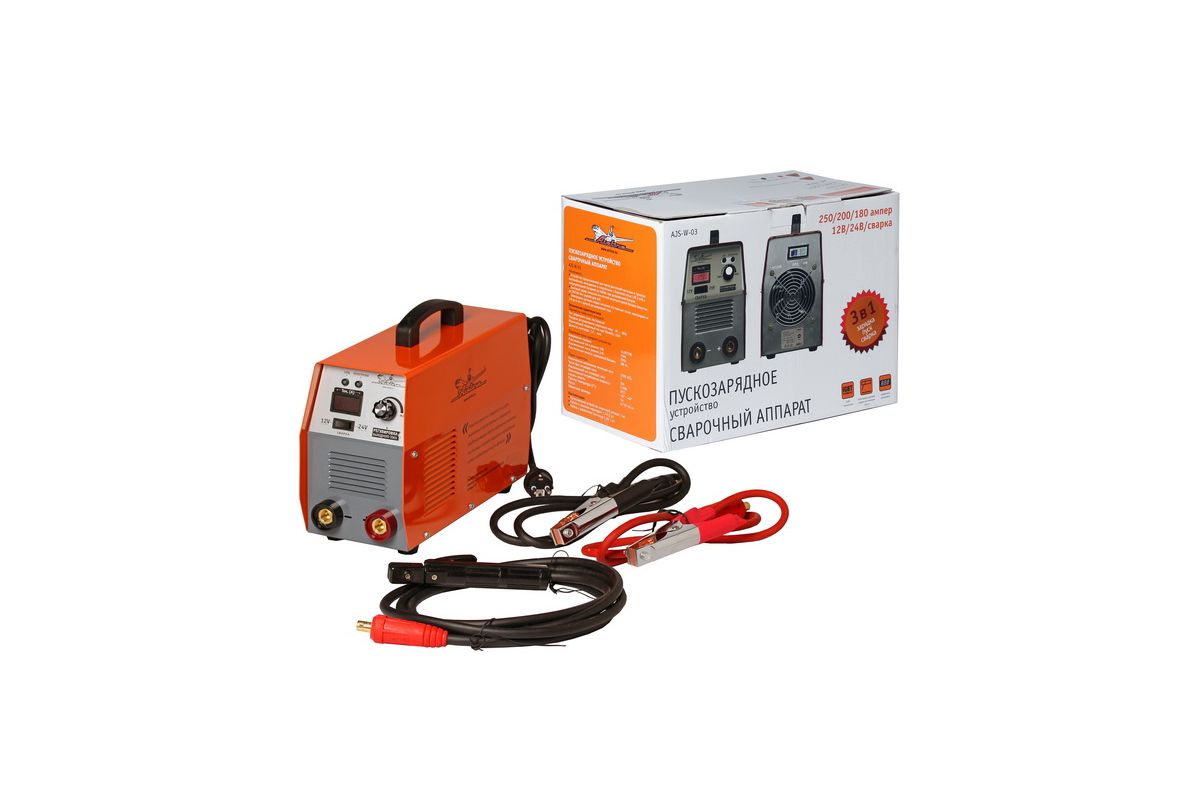 Пуско-зарядное устройство AIRLINE AJS-W-03 — легко и быстро зарядит АКБ или сборку из нескольких АКБ, запустит двигатели легковых и грузовых автомобилей, специальной техники. Кроме того, может использоваться для сварочных работ. Максимальный пусковой ток — 250 А, сварочный — 180 А. Поставляется вместе с мощными кабелями.