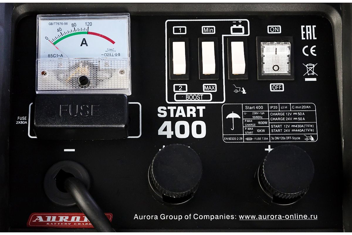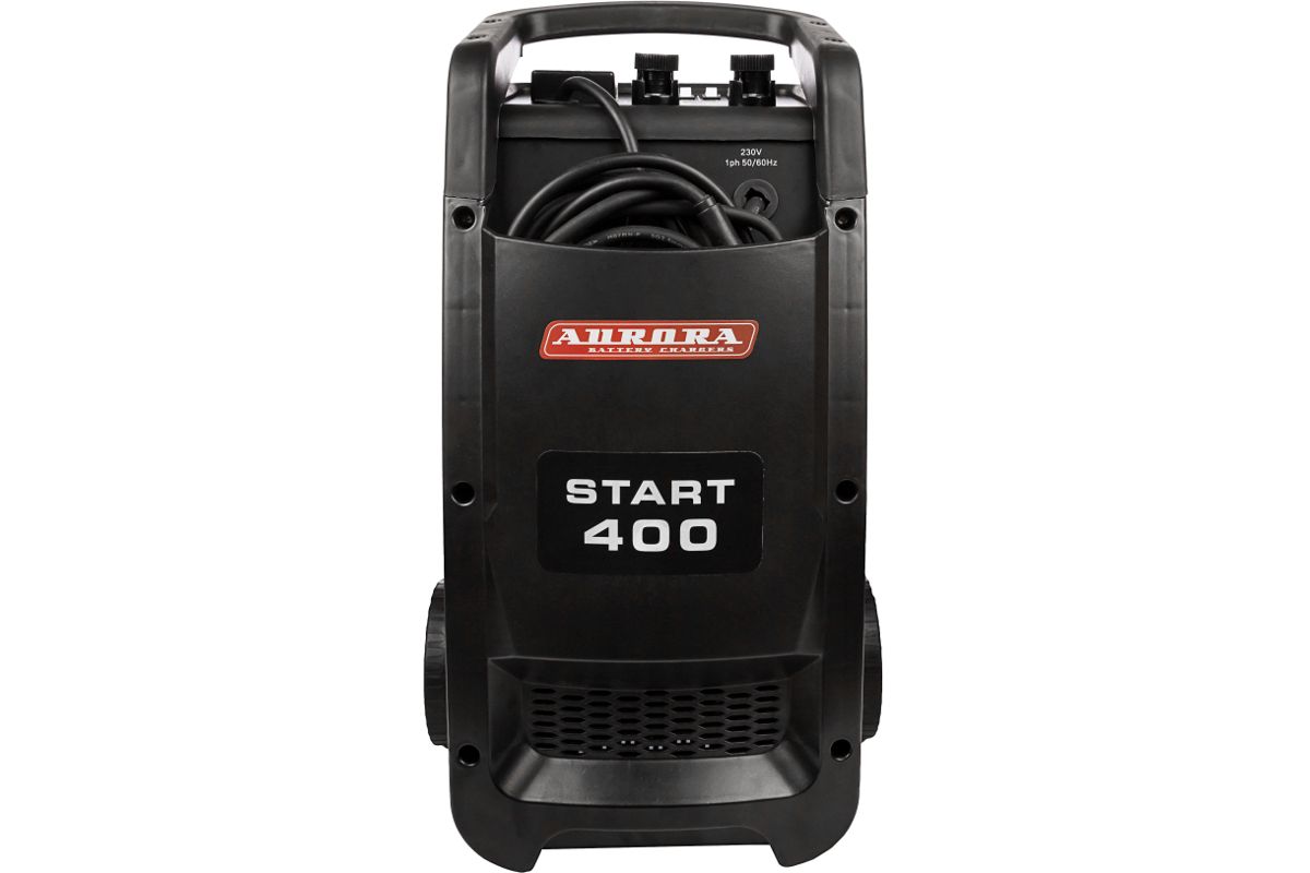 Пуско-зарядное устройство AURORA START 400 BLUE — быстро и качественно зарядит свинцово-кислотные АКБ всех типов. Также используется для запуска двигателей. Это надежный, мобильный и простой в эксплуатации прибор. Допустимая емкость — от 40 до 700 Ач. Потребляемая мощность при зарядке — 1,6 кВт; в пусковом режиме — 10 кВт.