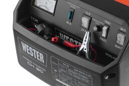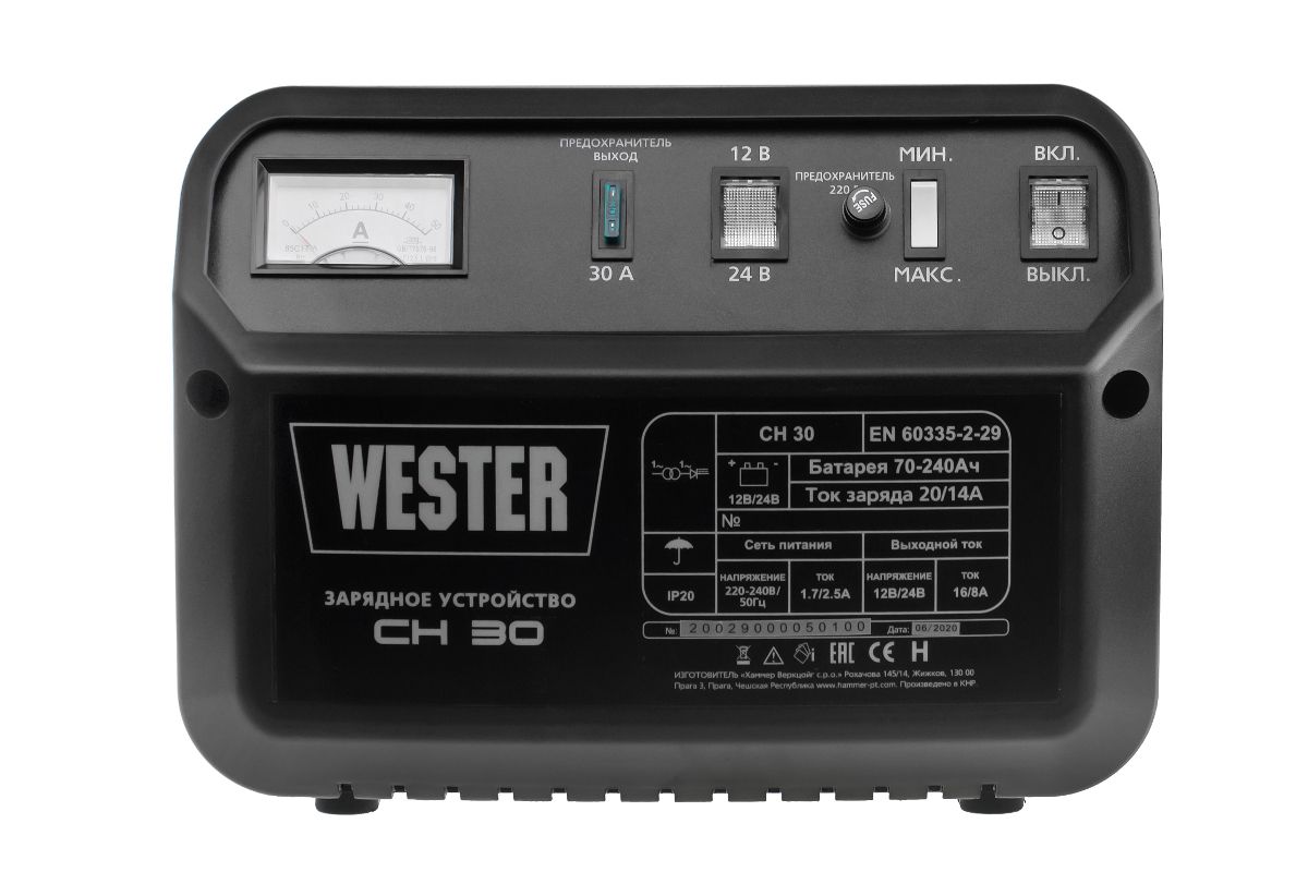 WESTER CH30 — 700-ваттное зарядное устройство для автомобильных аккумуляторов (напряжением 12 или 24 В). Позволяет зарядить батарею любого типа (для мотоциклов, катеров, легковых или грузовых автомобилей). Рекомендованная емкость — 70-240 А/ч. На выбор есть стандартный или ускоренный режим зарядки. Выходной ток заряда — 20 А (макс.). Следить за текущими показателями силы тока можно по амперметру на передней панели.