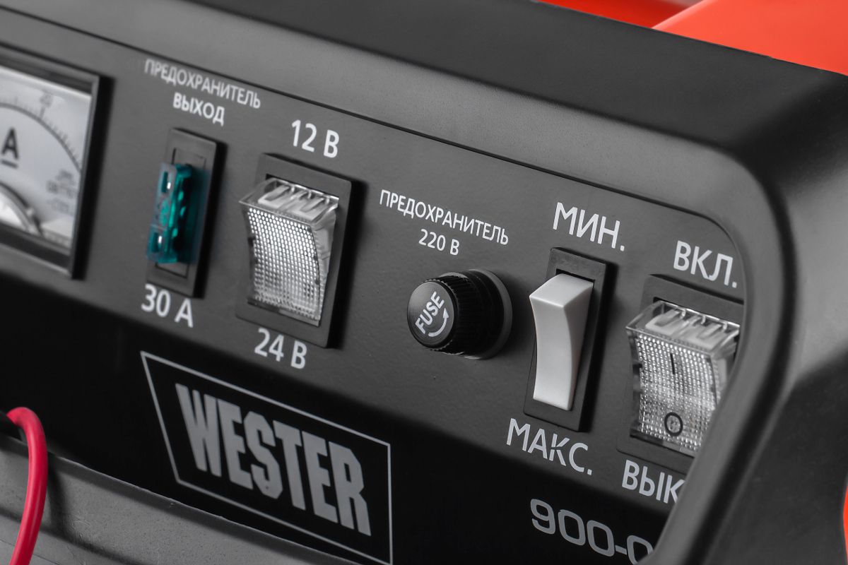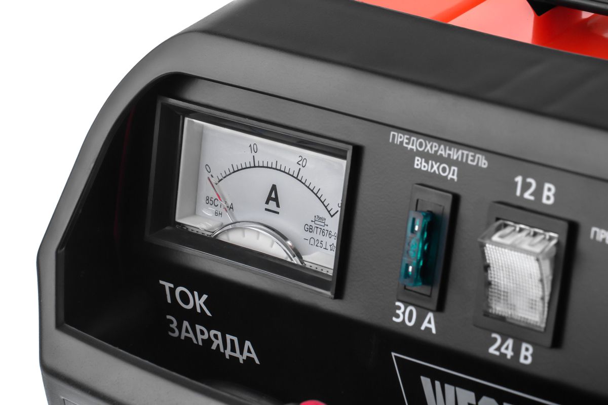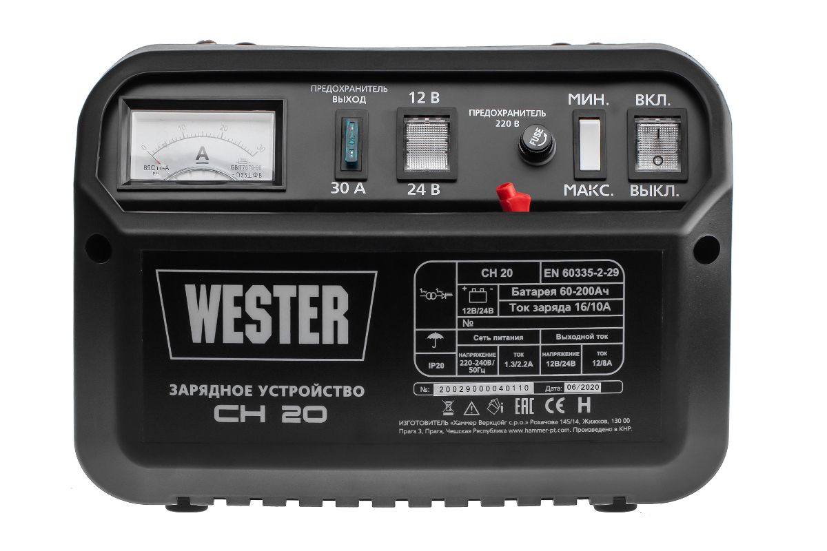 WESTER CH20 — переносное устройство для зарядки автоаккумуляторов с напряжением 12 или 24 В и емкостью 60-200 А/ч. Разрешается подключать АКБ любого типа: для бензиновых и дизельных двигателей, катеров, мотоциклов. Выходной ток заряда достигает 16 А. Чтобы пользователь мог сам отслеживать процесс зарядки, предусмотрен встроенный амперметр. Также есть ускоренный режим, при котором заряд восстанавливается в разы быстрее. Вес модели — 5 кг.