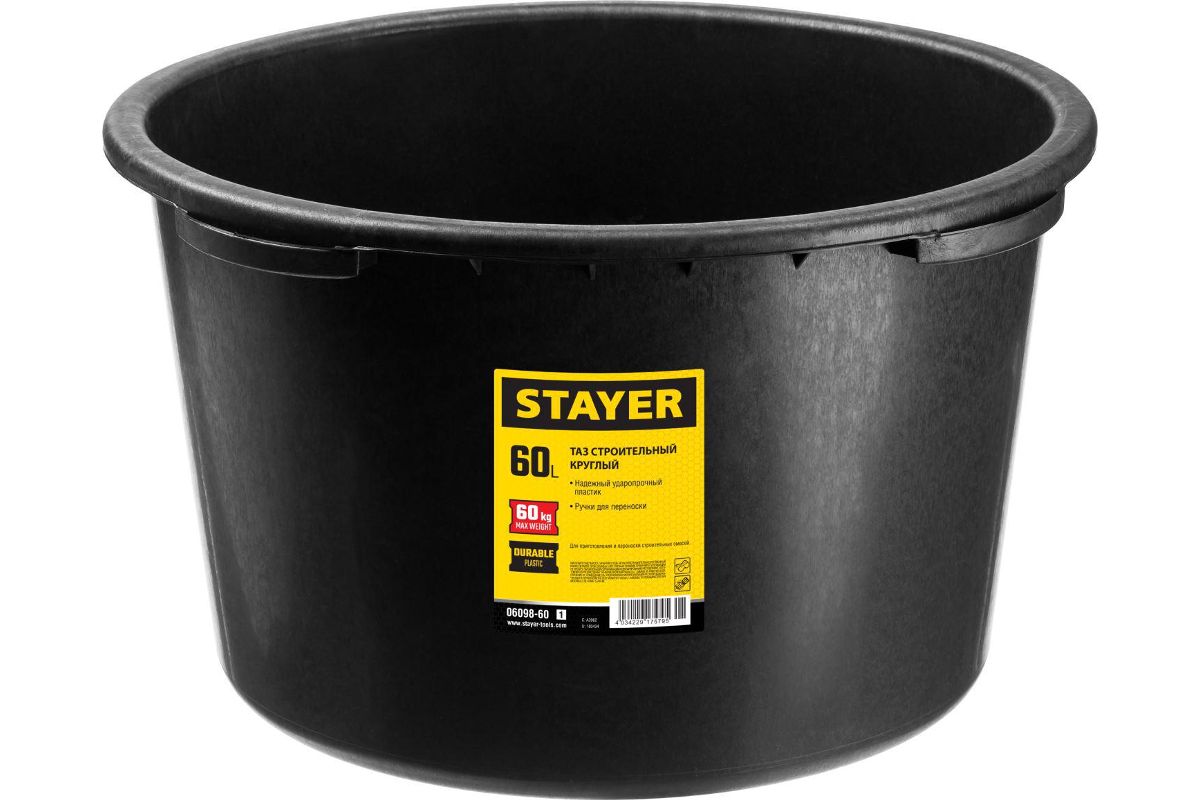 Таз STAYER 06098-60_z01 строительный круглый, 60 л -Надежный ударопрочный пластик -Ручки для переноски