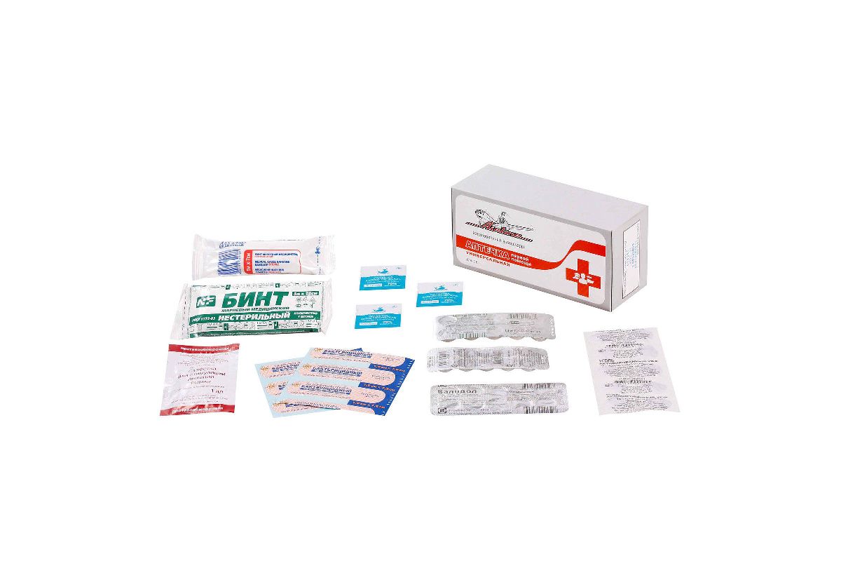 - Данная аптечка укомплектованна, помимо перевязочного материала, медицинскими препаратами от головной боли, отравлений, сердечной недостаточности.