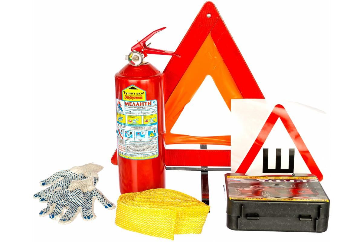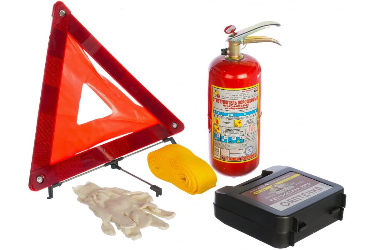 - Набор включает в себя аптечку нового образца, огнетушитель, буксировочный трос, знак аварийной остановки и перчатки;