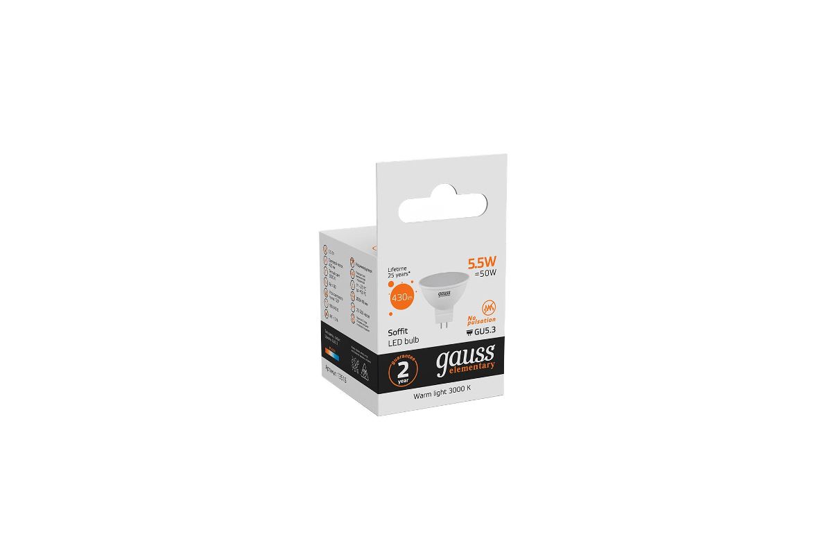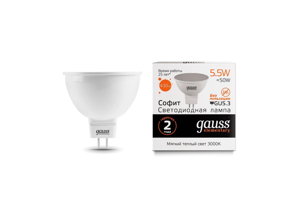 Лампа GAUSS LED Elementary MR16 5.5W 430lm 3000К GU5.3 LED 1/10/100 (13516)