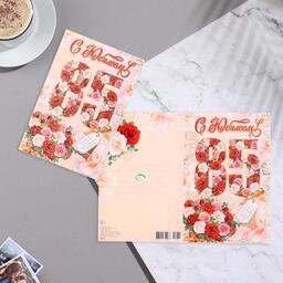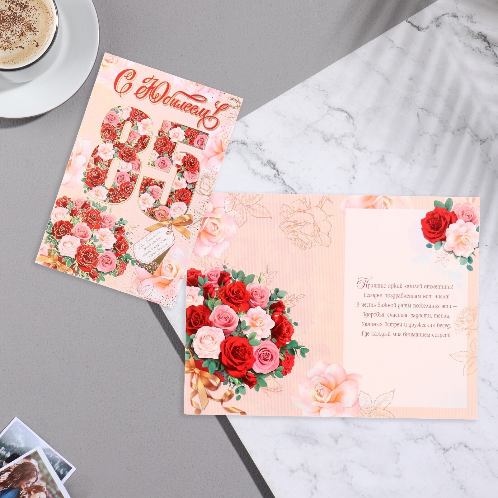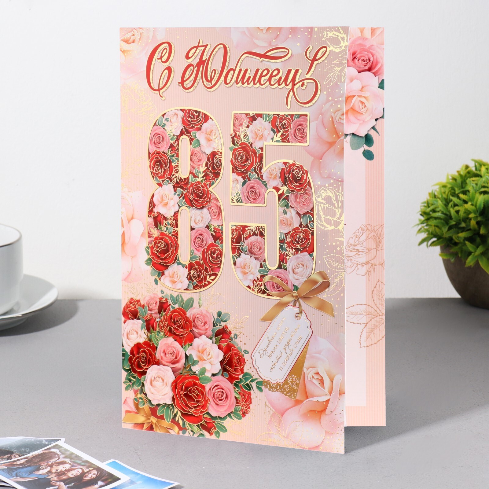Открытка "С Юбилеем! 85" розы, бирка, розовый фон, 19х29 см