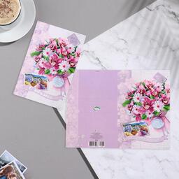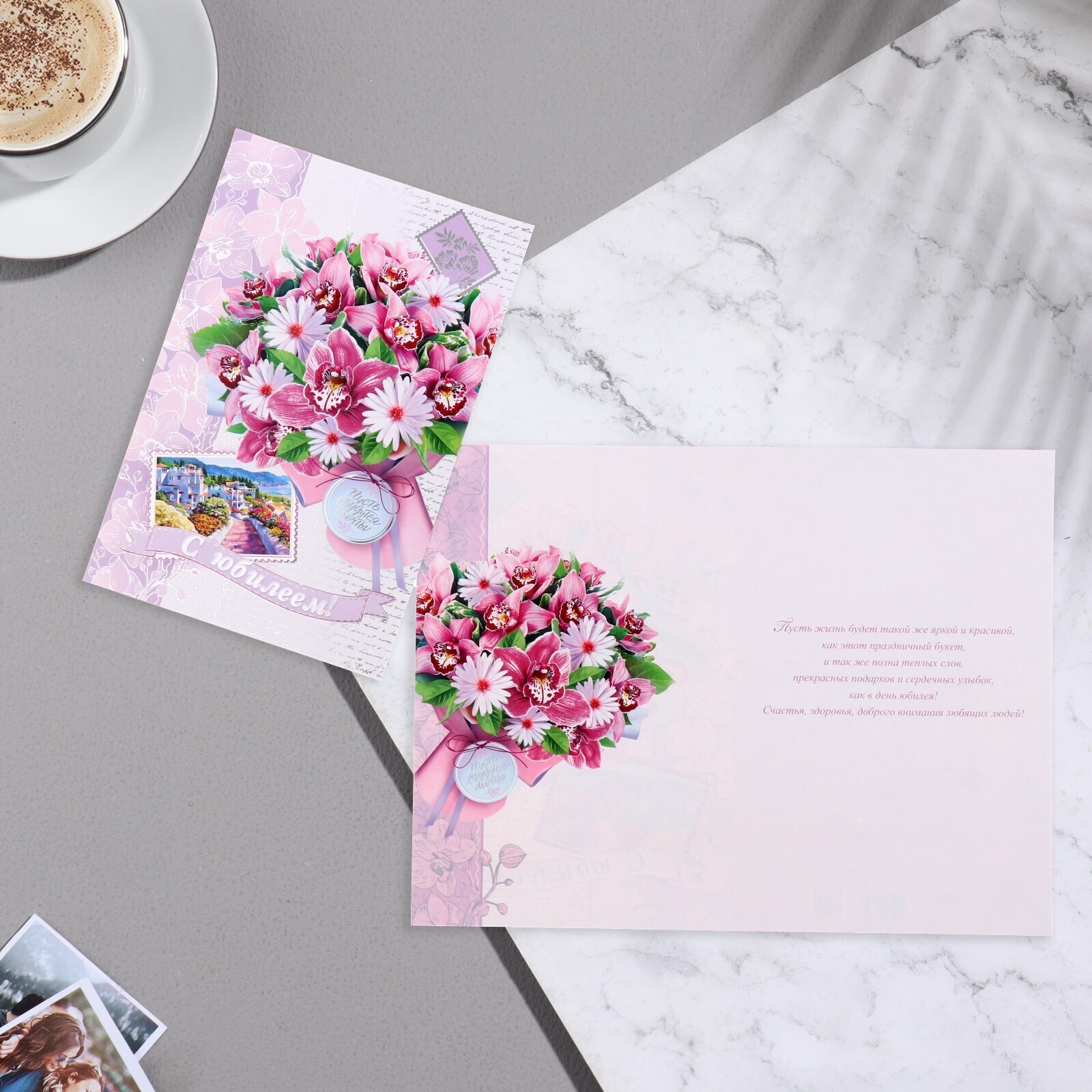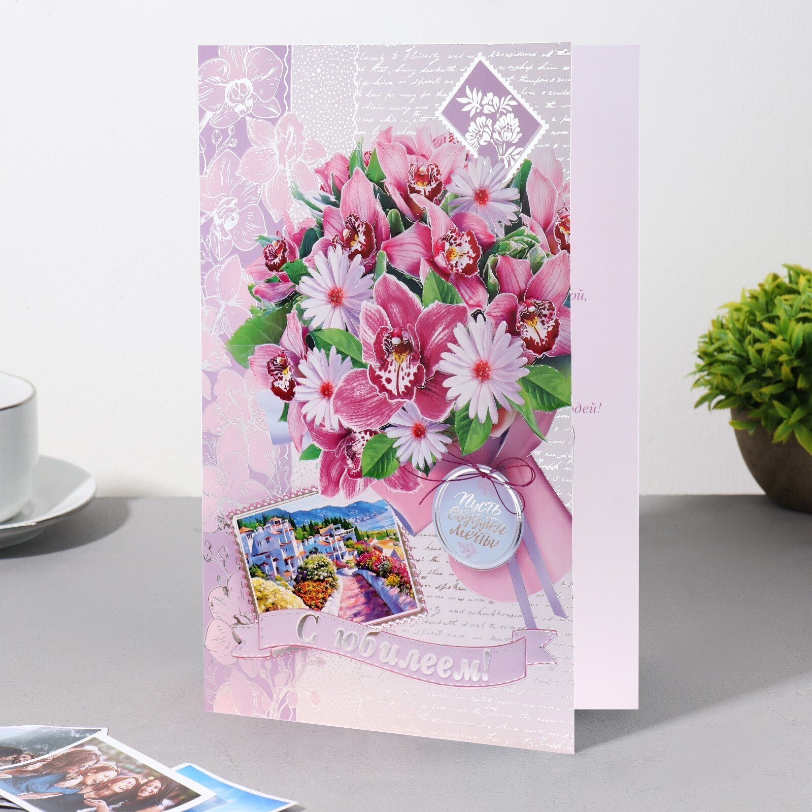 Открытка "С Юбилеем!" фиолетовый букет, пейзаж, 19х29 см