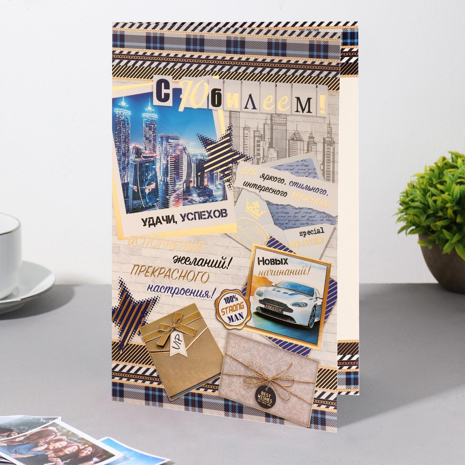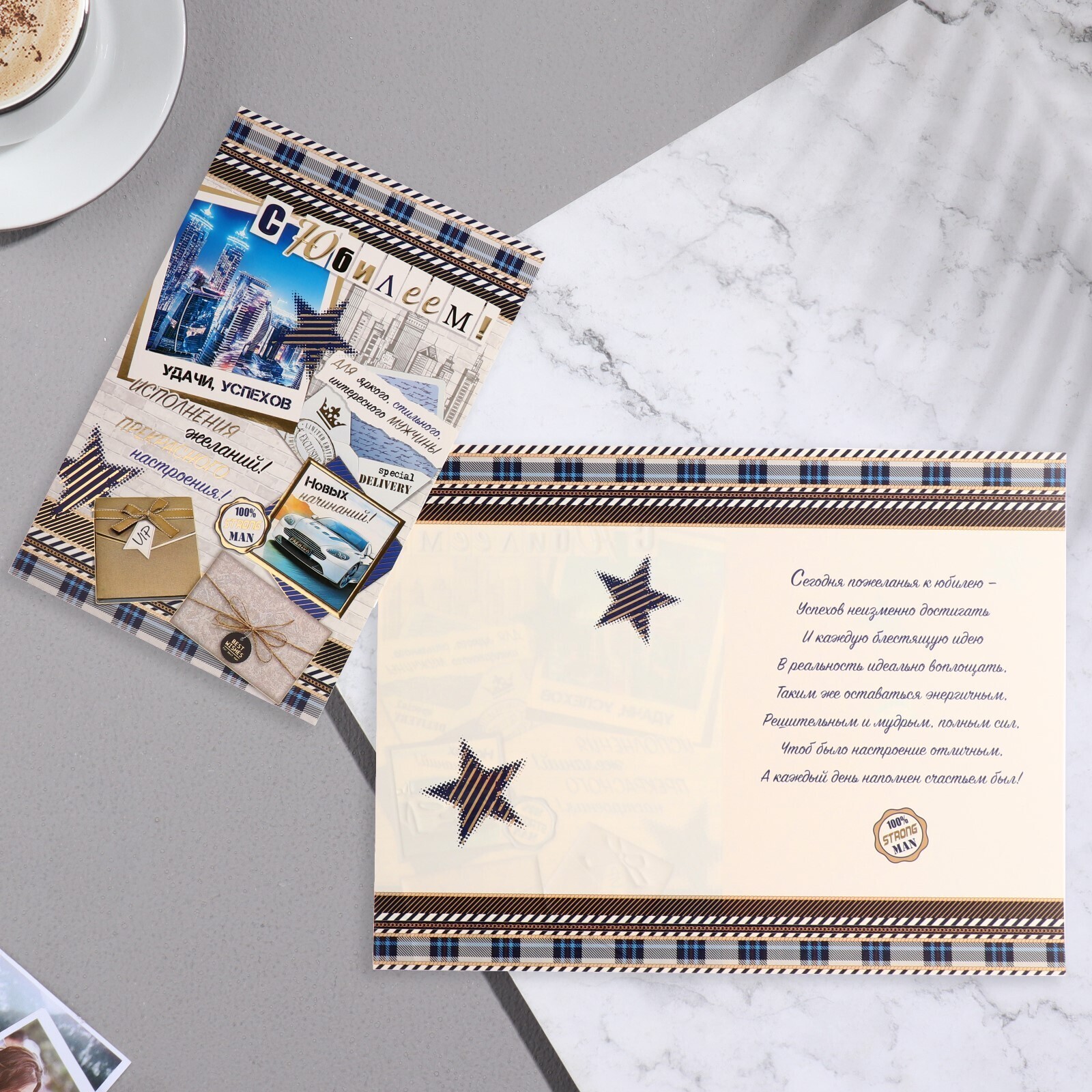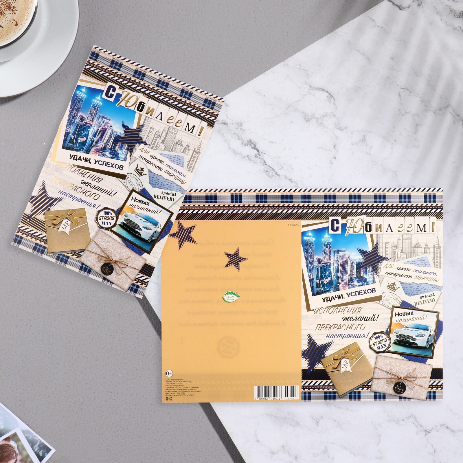 Открытка "С Юбилеем!" тиснение, город, машина, 37,9х16 см