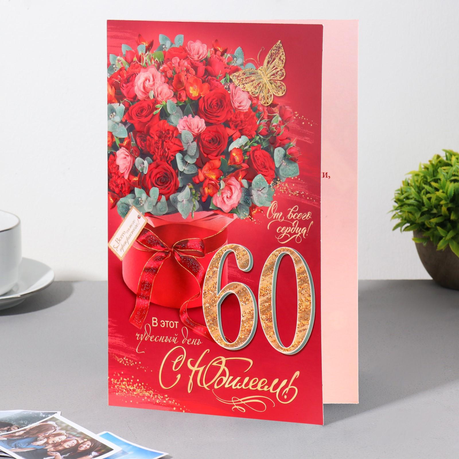 Открытка "С Юбилеем! 60" конгрев, букет, бабочка, 12,5х19,4 см